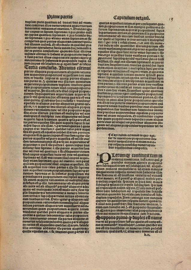 duplas, puta quattuor ad duo, et duo ad unum, tunc coacerva illos numeros, puta quaternarium, binarum et unitatem, et invenies 7. Dividas igitur corpus in septem septimas, et pro primo ordine capias quattuor septimas et pro secundo duas septimas et pro ultimo unam septimam, et sic comperies, quot partes aliquotas continet quilibet illorum ordinum. Et isto modo in qualibet proportione operaberis facile autem hoc demonstratur ex prima conclusione, quoniam sicut illi tres ordines continuo se habent in proportione dupla, et sunt partes illius corporis, ita op[o]rtet capere partes continuo se habentes in proportione dupla totum corpus absolventes eo, quod operati sumus artificio.