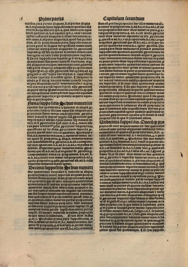 Decima suppositio: si duo numeri sive quantitates inaequales se habeant in aliqua proportione, et minor deperdat aliquam proportionem stante m[a]iore, illam proportionem acquirit proportio, quae est inter maiorem quantitatem et minorem, et si tantam proportionem deperdat quantitas maior sicut minor, tunc proportio inter maiorem et minorem nec augetur nec diminuitur, sed semper manet aequalis extremis manentibus quantitatis.