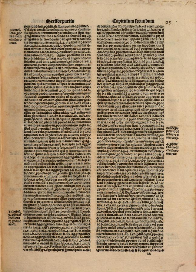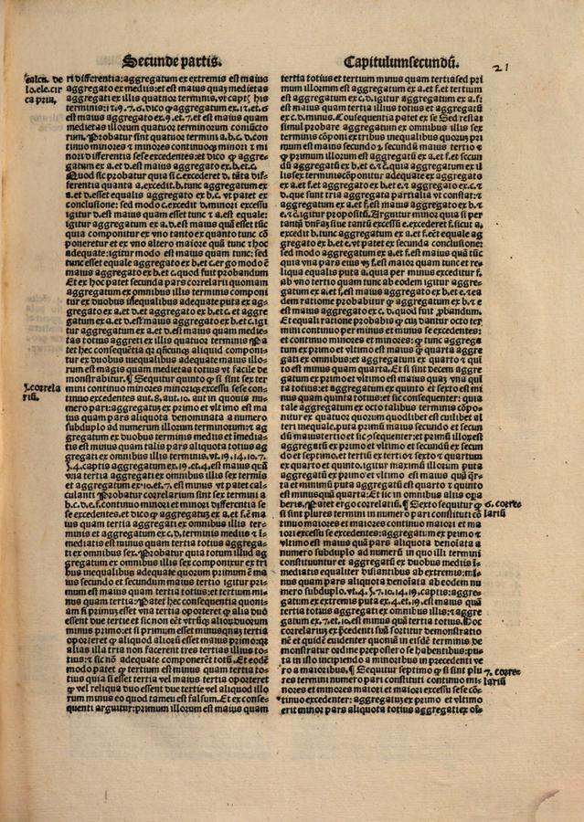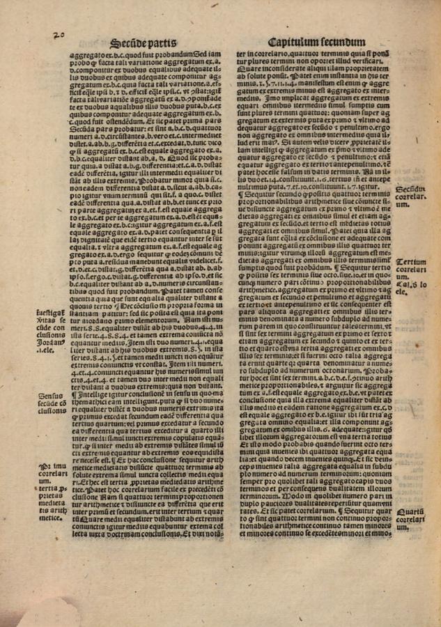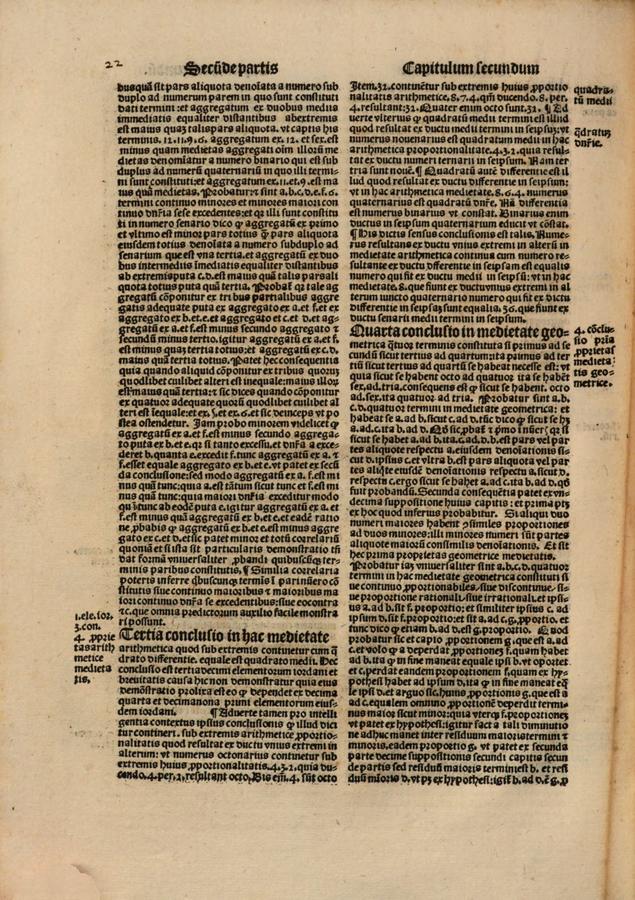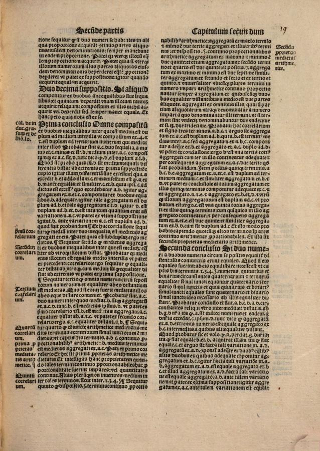 Prima conclusio: omne compositum ex duobus inaequalibus, inter quae est medium, est duplum ad medium inter illa, ut [c]ompositum ex 4 et 2 est duplum ad ternarium numerum, qui mediat inter illos. Probatur: sint A [et] C duo inaequalia, A maius et C minus, et sit B medium inter A [et] C, compositumque ex A [et] C sit D, tunc dico, quod D est duplum ad B. Quod sic probo, quia cum B sit medium, aequali differentia distat ab extremis ex prima suppositione, capio igitur illam differentiam sive excessum, qua A excedit B, et addo illam C, et manifestum est, quod A et B manent aequalia, et similiter C et B, quia ipsi C addictus est excessus, quo excedebatur a B, igitur aggregatum ex A et C componitur ex duobus aequalidus B adaequate. Igitur tale aggregatum est duplum ad B, et tale aggregatum est D, igitur D est duplum ad B, et D est in tantum, quantum erat ante variationem A [et] C, ut patet ex ultima suppositione, igitut D ante variationem AC est duplum ad B. Quod fuit probandum. ¶ Ex hac conclusione sequitur, quod medium inter duo inaequalia est medietas aggregati ex eis. Patet, quia est subduplum, ergo medietas. ¶ Sequitur secundo, quod medietas aggregati ex duobus inaequalibus, inter quae est medium, aequaliter ab utroque illorum distat. Probatur, quia medietas illorum est aequalis medio inter illa, ut patet ex praecedenti correlario, ergo sequitur, quod aequaliter distat ab utroque, cum medium sit, quod aequaliter distat ab extremis, ut patet ex prima suppositione. ¶ Sequitur tertio, quod omnis numerus circum se positorum numerorum et aequaliter ab eo distantium est medietas. Quod si eorum fuerit medietas, illos ab eo aeque distare conveniet. Probatur: sint A [et] C duo numeri, inter quos mediat B, sitque [D] aggregatum ex A [et] C, tunc B est medietas ipsius D, ut patet ex primo correlario, et si B est medietas aggregati A [et] C, aequaliter distat ab A et C, ut patet ex secundo correlario, ergo A [et] C aequaliter distant a B. ¶ Sequitur quarto, quod coniunctae arithmeticae medietatis medi[u]s terminus extremorum simul iunctorum est medietas, ut captis his terminis A, B, C continuo proportionabilibus arithmetice B medius terminus est medietas aggregati ex A [et] C. Patet ex primo correlario. Et haec sit prima proprietas arithmeticae medietatis. Et intelligas hanc proprietatem, quando tales termini continuo proportion[]abiles hac proportionalitate fuerint impares vel quantitates continuae. Alias plerumque non invenires medium inter tales terminos sicut inter 2, 3, 4, 5. ¶ Sequitur quinto, quod dispositis 3 terminis continuo proportionabilibus arithmetice aggregatum ex maximo termino et minimo est duae tertiae aggregati ex illis tribus terminis, et dispositis 5 continuo proportionalibus arithmetice aggregatum ex maximo et minimo est duae quintae, et etiam aggregatum ex secundo termino et quarto est duae quintae, et positis 7 aggregatum ex maximo et minimo est duae septimae, similiter aggregatum ex secundo et sexto et [aggregatum] ex tertio et quinto, et universaliter ubicumque plures termini in numero impari arithmetice continuo proportionantur, semper aggregatum ex quibuscumque duobus aequaliter distantibus a medio est duae partes aliquotae aggregati ex omnibus illis, quarum partium aliquotarum utraque denominatur a numero impari, a quo denominantur illi termini, ut si termini sint undecim, denominabuntur duae undecimae, et si 13, duae tridecimae. Probatur hoc correlarium, et signo tres terminos A [et] B [et] C, et arguo sic: aggregatum ex A [et] C est duplum ad B, quia B est terminus medius inter A [et] C, sed aggregatum ex A [et] B [et] C componitur adaequate ex B et aggregato ex A [et] C duplo ad B, ut patet ex conclusione, ergo B est una tertia totius aggregati, cum ter in illo contineatur adaequate, et per consequens aggregatum ex A [et] C duae tertiae. Quod fuit probandum. Item positis quinque t[e]rminis A [et] B [et] C [et] D [et] E. aggregatum ex A et E est duplum ad terminum medium C, et similiter aggregatum ex B et D, ut patet ex conclusione, et totum aggregatum ex illis quinque terminis componitur adaequate ex C et ex aggregato A et E et aggregato ex B et D, et utrumque illorum aggregatorum est duplum ad C, ut probatum est, ergo C est una quinta totius aggregati ex illis quinque terminis, cum quinquies in illo aggregato contineatur, et per consequens aggregatum ex A et E est duae quinte, et similiter aggregatum ex B [et] D, cum sit duplum ad C. Et isto modo probabis capiendo quotcumque alios terminos impares continuo arithmetice proportionabiles. Et ista sit secunda proprietas medietatis arithmeticae.