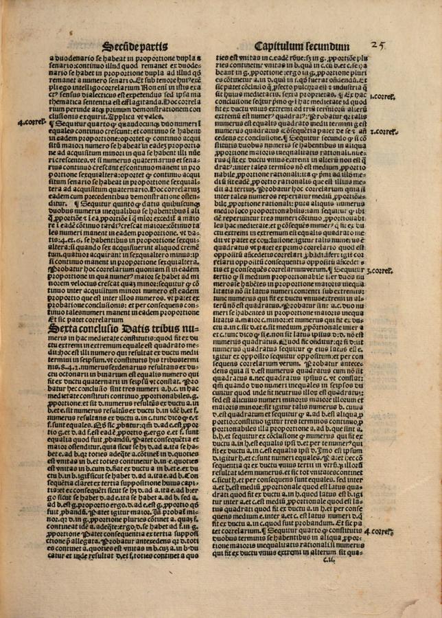 inter tales numeros reperitur medium proportionabile proportione rationali, ita quod primi ad ipsum sit ea proportio rationalis, quae est ipsius ad tertium, et illius numeri quadrati tale medium est unum latus. Probatur prima pars huius correlarii, quia illa pars est una conditionalis, ex cuius opposito consequentis sequitur oppositum antecedentis, ut patet ex secundo correlario, igitur illa pars vera. Secunda probatur ex correlario immediate praecendenti. ¶ Sequitur quinto, quod inter primos numeros proportionis duplae, triplae, octuplae, sesquialterae et cetera non invenitur medium proportionabile proportione rationali. Probatur primo de dupla, quae est inter istos terminos 4 [et] 2, quoniam numerus, qui fit ex ductu unius extremi in alterum, puta 4 in 2, non est quadratus, igitur inter illa extrema non invenitur medium proportionabile proportione rationali. Antecedens patet intelligenti definitionem numeri quadrati, et consequentia patet ex secundo correlario. Et eodem modo probabis reliquas partes. ¶ Et ex hoc habes pulchrum documentum ab cognoscendum, quando aliqua proportio inaequalitatis habet subduplam proportionem ad eam rationalem. Quando enim numerus resultans ex ductu unius extremi in alterum non est quadratus, tunc talis proportio non habet proportionem rationalem subduplam ad illam, cum non habeat medium proportionabile proportione rationali, et sic tale medium inter terminos illius proportionis non se habet ut numerus respectu alicuius extremi illius proportionis. Si enim se haberet ut numerus, maioris extremi ad ipsum esset aliqua proportio rationalis, et ipsius ad minimum extremum esset eadem proportio rationalis, et sic iam ibi essent tres numeri continuo proportionabiles in hac medietate geometrica, et sic numerus, qui fit ex ductu extremi in extremum, esset quadratus, ut patet ex primo correlario, quod est oppositum dati. Et ex hoc facile elicitur proportionem irrationalem necessario ponendam esse, quod nota.