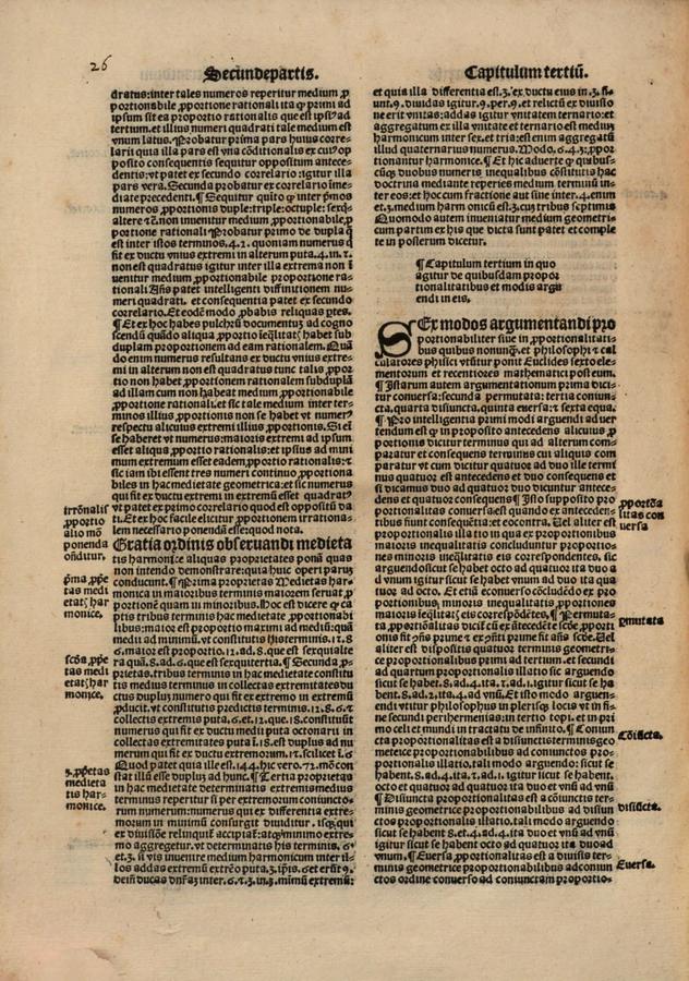 Gratia ordinis observandi medietatis harmonicae aliquas proprietates potentiae, quas non intendo demonstrare, quia huic operi parum conducunt. ¶ Prima proprietas: medietas harmonica in maioribus terminis maiorem servat proportionem quam in minoribus. Hoc est dicere, quod captis tribus terminis hac medietate proportionabilibus maior est proportio maximi ad medium quam medii ad minimum, ut constitutis his terminis 12, 8, 6 maior est proportio 12 ad 8, quae est sesquialtera, quam 8 ad 6, quae est sesquitertia. ¶ Secunda proprietas: tribus terminis in hac medietate constitutis medius terminus in collectas extremitates ductus duplum numero, qui fit ex extremo in extremum, producit, ut constitutis praedictis terminis 12, 8, 6 et collectis extremis, puta 6 et 12, quae 18 constituunt, numerus, qui fit ex ductu medii, puta octonarii, in collectas extremitates, puta in 18, est duplus ad numerum, qui fit ex ductu extremorum 12 scilicet in 6. Quod patet, quia ille est 144, hic vero 72, modo constat illum esse duplum ad hunc. ¶ Tertia proprietas in hac medietate determinatis extremis medius terminus reperitur, si per extremorum coniunctorum numerum numerus, qui ex differentia extremorum in minimum consurgit, dividitur, isque, qui ex divisione relinquitur accipiatur, atque minimo extremo aggregatur, ut determinatis his terminis 6 et 3 si vis invenire medium harmonicum inter illos, addas extremum extremo, puta 3 ipsis 6, et erunt 9, deinde ducas differentiam inter 6 et 3 in 3 minimum extremum, | et quia illa differentia est 3, ex ductu eius in 3 fiunt 9, dividas igitur 9 per 9, et relictum ex divisione erit unitas, addas igitur unitatem ternario, et aggregatum ex illa unitate et ternario est medium harmonicum inter sex et tria, est enim aggregatum illud quaternarius numerus. Modo 6, 4, 3 proportionantur harmonice. ¶ Et hic adverte, quod quibuscumque duobus numeris inaequalibus constitutis hac doctrina mediante reperies medium terminum inter eos, et hoc cum fractione aut sine, inter 4 enim et 3 medium harmonicum est 3 cum tribus septimis. Quomodo autem inveniatur medium geometricum partim ex his, quae dicta sunt, patet, et complete in posterum dicetur.