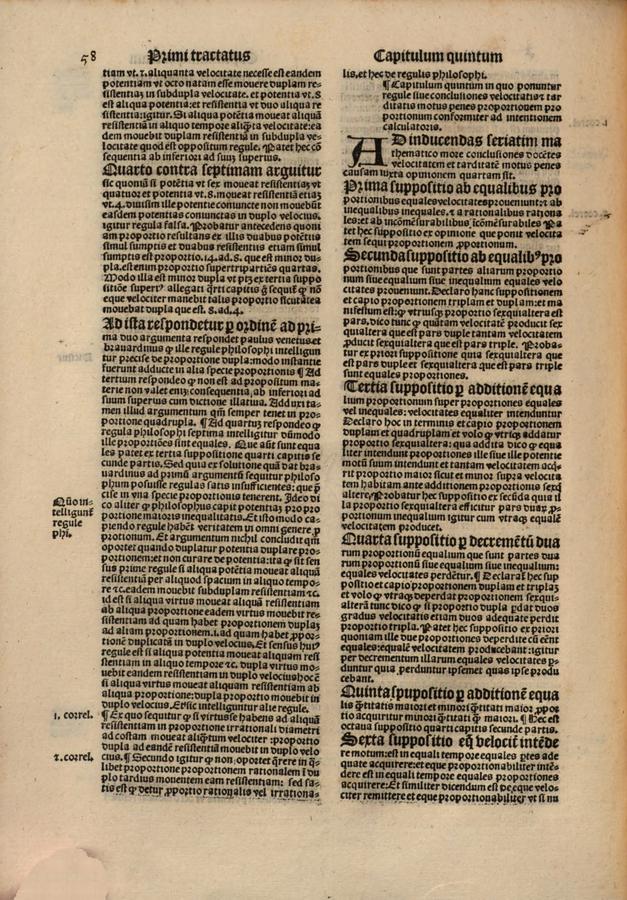 ¶ Ex quo sequitur, quod si virtus se habens ad aliquam resistentiam in proportione irrationali diametri ad costam moveat aliquantum velociter, proportio dupla ad eandem resistentiam movebit in duplo velocius. ¶ Secundo igitur, quod non oportet quaerere in qualibet proportione proportionem rationalem in duplo tardius moventem eam resistentiam, sed satis est, quod detur proportio rationalis vel irrationalis. | Et haec de regulis philosophi