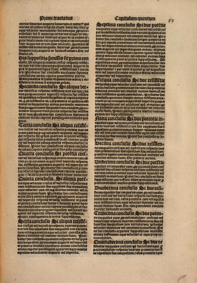 Quartadecima conclusio: si duae resistentiae inaequales crescant vel decrescant aeque proportionabiliter respectu duarum potentiarum sive aequalium sive in[ae]qualium, tales potentiae aequevelociter