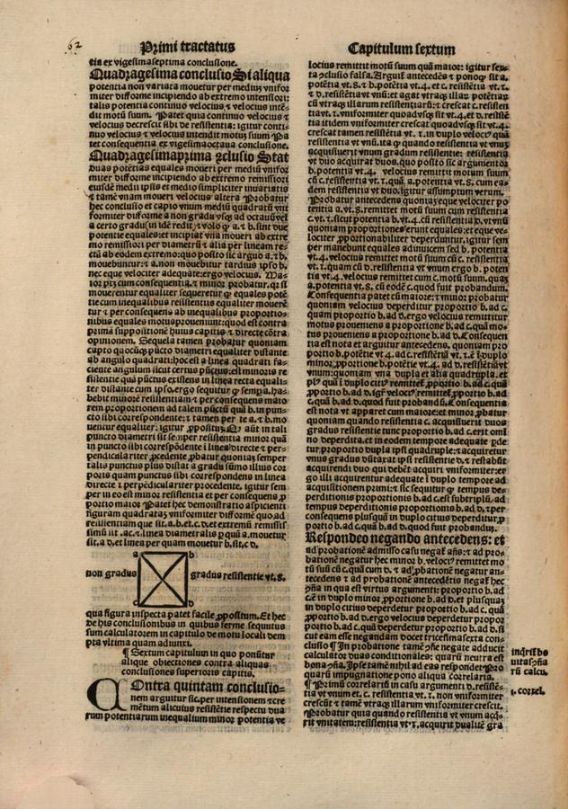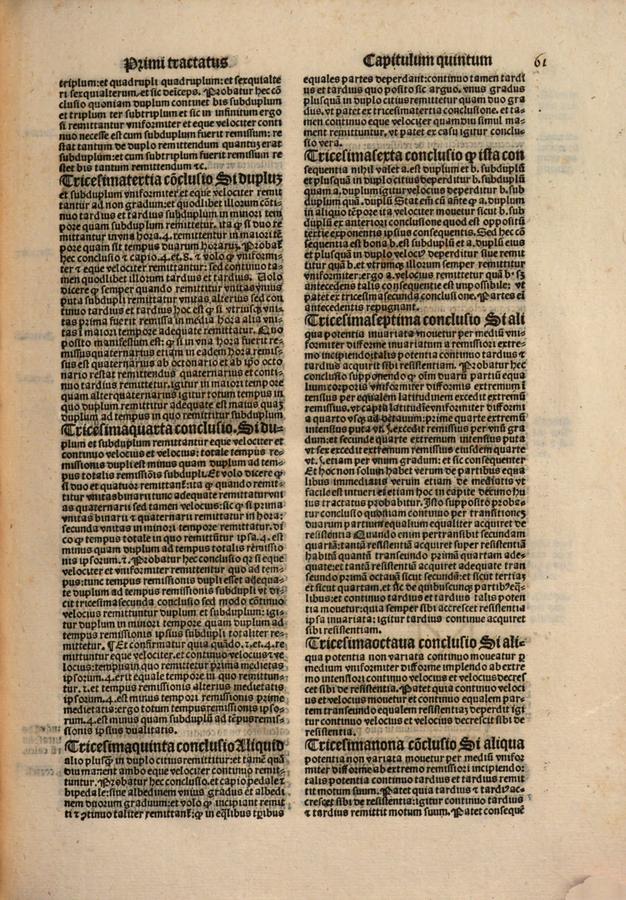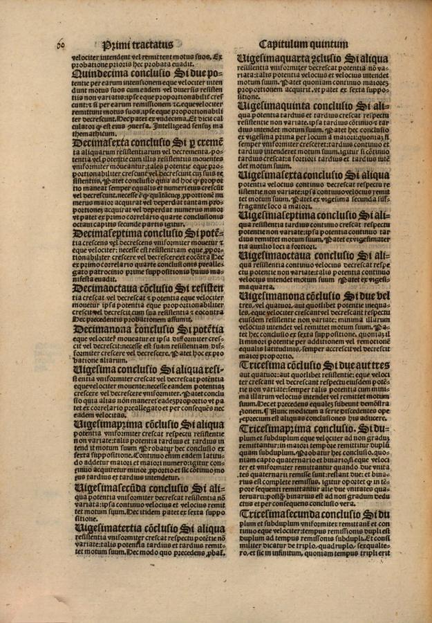 Vigesimasexta conclusio: si aliqua potentia velocius continuo decrescat respectu resistentiae non variatae, ipsa conti[n]uo velocius remittet motum suum. Patet ex vigesimasecunda suffragante loco a maiori.