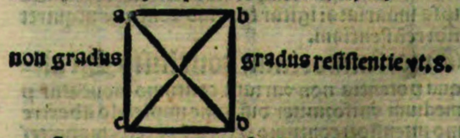 Tricesimaseptima conclusio: si aliqua potentia invariata movetur per medium uniformiter difforme invariatum a remissiori extremo incipiendo, talis potentia continuo tardius et tardius acquirit sibi resistentiam. Probatur haec conclusio supponendo, quod omnium duarum partium aequalium corporis uniformiter difformis extremum intensius per aequalem latitudinem excedit extremum remissius, ut capta latitudine uniformiter difformi a quarto usque ad octavum primae quartae extremum intensius, puta ut 5, excedit remissius per unum gradum, et secundae quartae extremum intensius, puta ut sex, excedit extremum remissius eiusdem quartae, ut 5, etiam per unum gradum et sic consequenter. Et hoc non solum habet verum de partibus aequalibus immediatis, verum etiam de mediatis, ut facile est intueri, et etiam hoc in capite decimo huius tractatus probabitur. Isto supposito probatur conclusio, quoniam continuo pertransitionem duarum partium aequalium aequaliter acquiret de resistentia. Quando enim pertransibit secundam quartam, tantam resistentiam acquiret super resistentiam habitam, quantam transeundo primam quartam adaequate, et tantam resistentiam acquiret adaequate transeundo primam octavam sicut secundam et sicut tertiam et sicut quartam et sic de quibuscunque partibus aequalibus, et continuo tardius et tardius talis potentia movetur, quia semper sibi accrescet resistentia ipsa invariata, igitur tardius continu[o] acquiret sibi resistentiam.