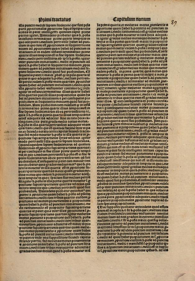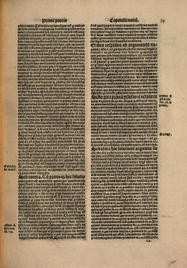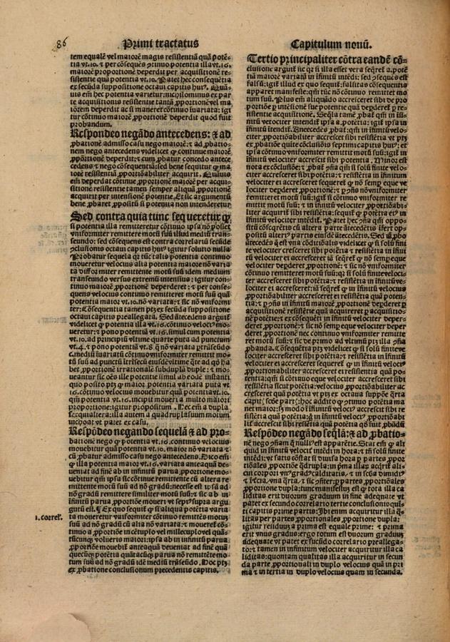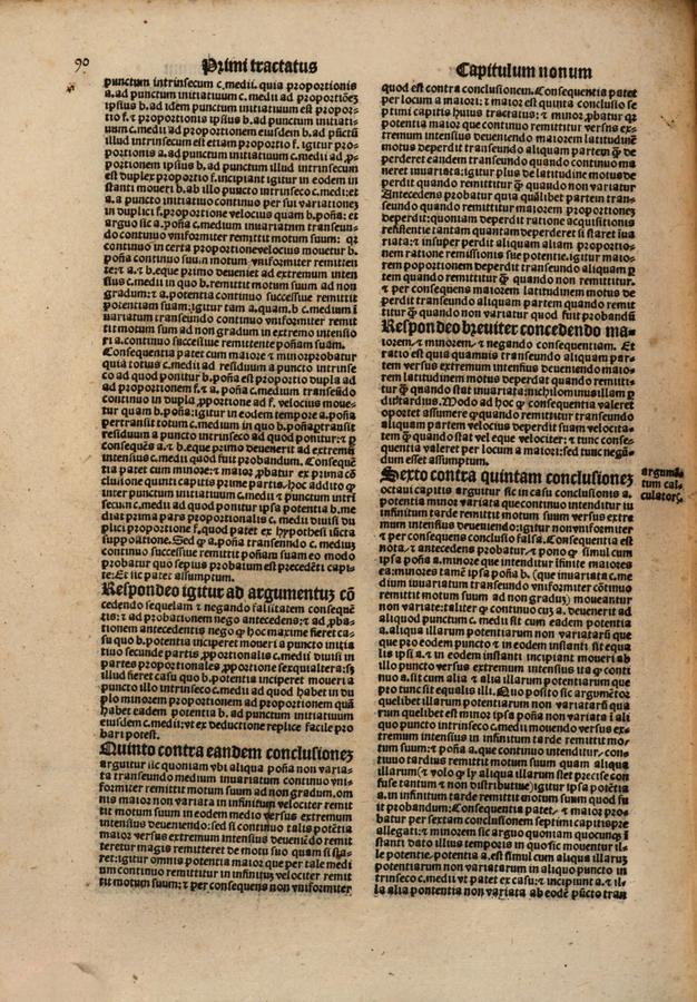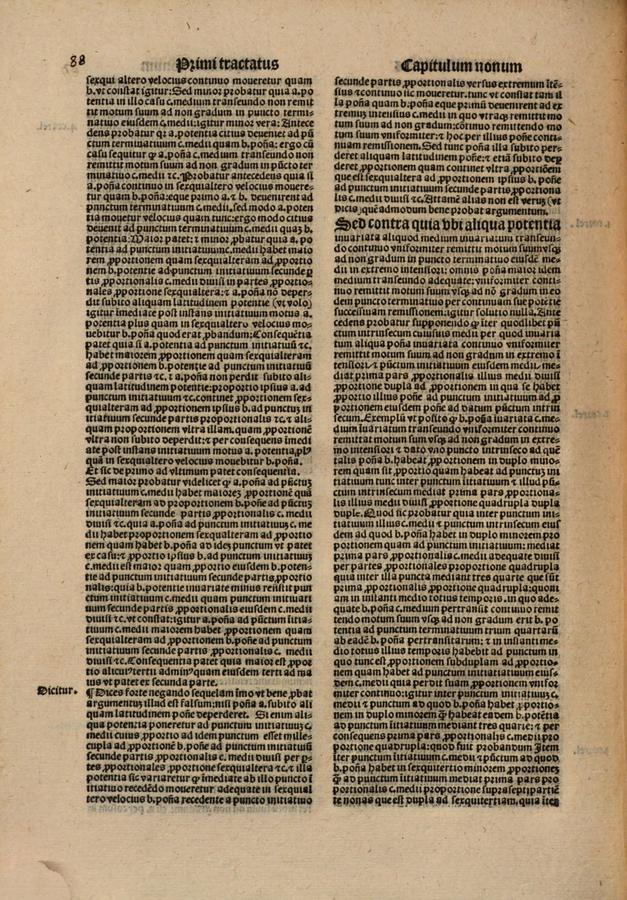 Secundo contra primam conclusionem octavi capitis arguitur sic, quia ubi aliqua potentia non variata idem medium invariatum transeundo uniformiter continuo remittit motum suum ad non gradum, omnis maior ad extremum intensius deveniendo in infinitum velociter remittit motum suum idem medium transeundo, igitur in tali medio nulla maior uniformiter remittit motum suum. Consequentia est nota, quam nulla, quae uniformiter remittit motum suum, in infinitum velociter remittit motum suum, qu[on]iam non uniformiter remitteret. Sed antecedens est quinta conclusio septimi capitis huius tractatus. ¶ Dices et bene distinguendo antecedens, aut ubi illa potentia maior manet continuo non variata, et sic concedo, aut si potentia varietur, et sic ego nego, et ad probationem nego, quod sit quinta conclusio septimi capitis et cetera. Dicit enim, illa conclusio: omnis potentia maior non variata.
