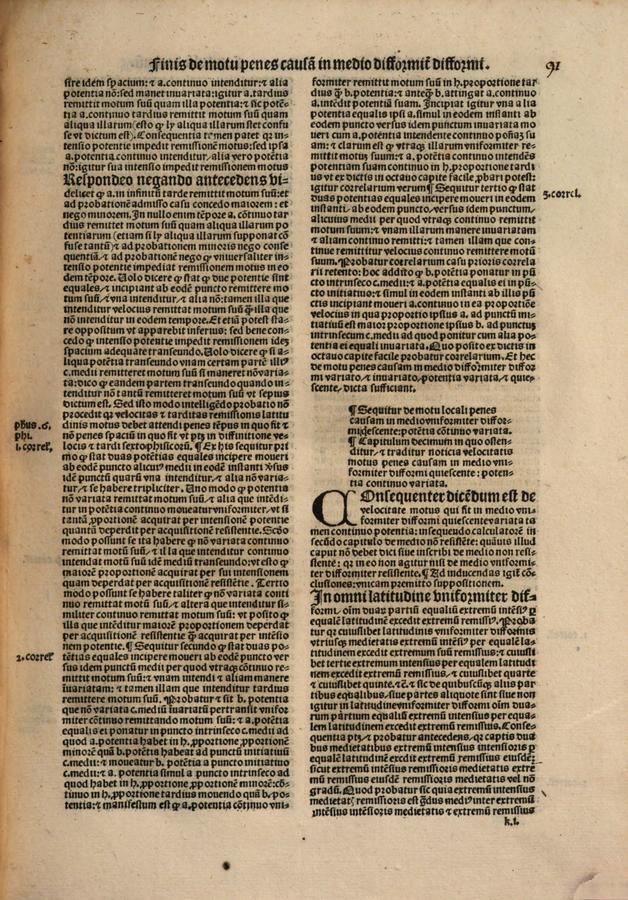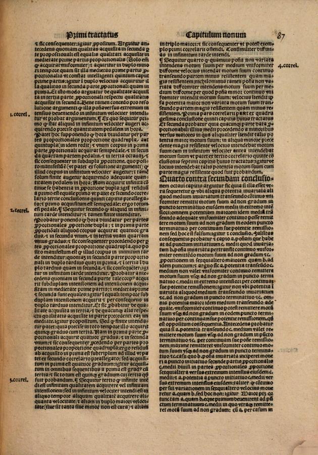 ¶ Sequitur quarto, quod quamvis potentia non variata intendens motum suum per medium uniformiter difforme velocius intendat motum suum continuo transeundo partem minus resistentem quam magis resistentem, nihilominus tamen potentia non variata difformiter intendens motum suum per medium difforme, per quod potentia minor continuo uniformiter intendit motum suum, velocius intendit ipsa potentia maior non variata motum suum transeundo partem magis resistentem quam minus resistentem. Prima pars correlarii patet ex quadragesima conclusione quinti capitis huius tractatus. Et secunda probatur, quia quacumque parte data proportionabili illius medii procedendo a minoribus versus maiores, in qua aliqualiter intendit talis potentia maior motum suum, in aliqua minore praecedente magis resistente velocius intendebat motum suum, cum in infinitum velociter antea {remittebat}2 motum suum, ut patet ex tertio correlario quintae conclusionis septimi capitis huius tractatus, igitur velocius intendebat talis potentia motum suum cum parte magis resistente. Quod fuit probandum.