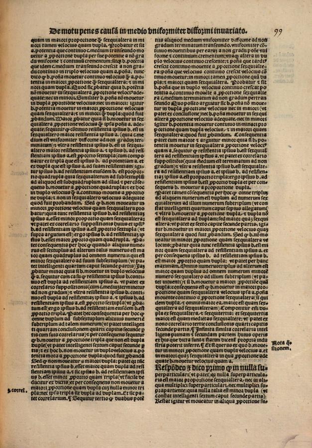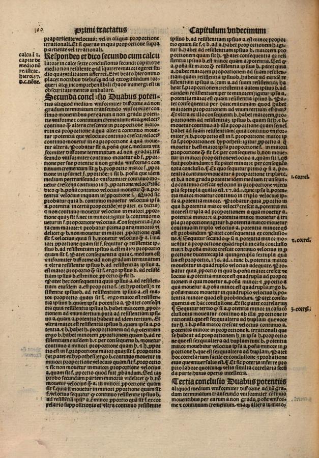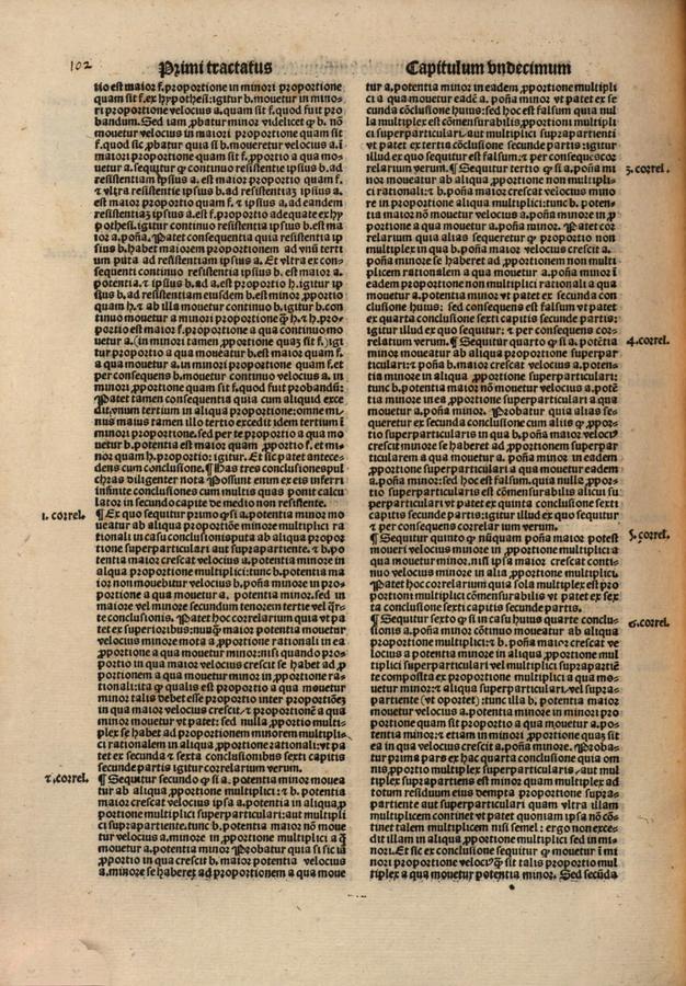 ¶ Ex quo sequitur primo, quod si A potentia minor moveatur ab aliqua proportione minore multiplici rationali in casu conclusionis, puta ab aliqua proportione superparticulari aut suprapartiente, et B potentia maior crescat velocius A potentia minore in al[i]qua proportione multiplici, tunc B potentia maior non movebitur velocius [A] potentia minore in proportione, a qua movetur A potentia minor, sed in maiore vel minore secundum tenorem tertiae vel quartae conclusionis. Patet hoc correlarium, quia, ut patet ex superioribus, numquam maior potentia movetur velocius minore mota a proportione rationali in ea proportione, a qua movetur minor, nisi quando proportio, in qua maior velocius crescit, se habet ad proportionem, a qua movetur minor in proportione rationali, ita quod qualis est proportio, a qua movetur minor, talis debet esse proportio inter proportionem, in qua maior velocius crescit, et proportionem, a qua minor movetur, ut patet, sed nulla proportio multiplex se habet ad proportionem minorem multiplici rationalem in aliqua proportione rationali, ut patet ex secunda et sexta conclusionibus sexti capitis secundae partis, igitur correlarium verum.