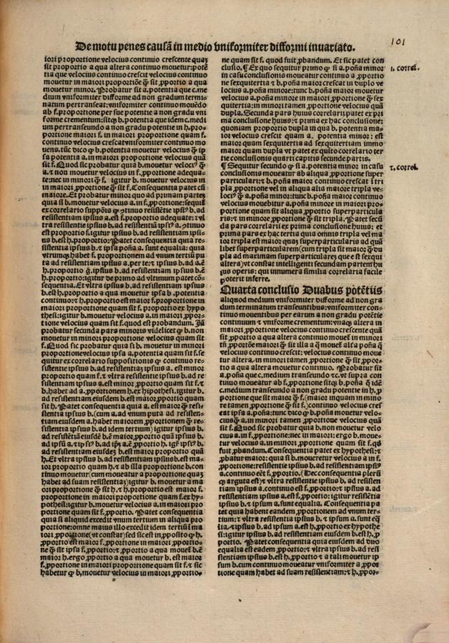 Hoc praemisso sit prima conclusio: duabus potentiis aliquod medium uniformiter difforme ad non gradum terminatum transeundo uniformiter continuo moventibus per earum a non gradu potentiae uniforme et continuum crementum unaque altera in certa proportione velocius continuo crescente potentia, quae velocius continuo crescit, velocius continuo movetur, in minori tamen proportione velocius continuo, quam sit proportio, in qua continuo velocius crescit. Probatur: sit A potentia, quae C medium uniformiter difforme terminatum ad non gradum transeundo uniformiter continuo movetur per suae potentiae a non gradu uniforme crementum, et B potentia C medium transeundo in F proportione velocius crescat continuo quam A potentia idem C medium transeundo continuo uniformiter movendo. Tunc dico, quod B potentia movetur velocius ipsa potentia A, in minori tamen proportione velocius quam sit F proportio, in qua B potentia velocius continuo crescit quam potentia A. Quod sic probatur, quia B potentia movetur velocius continuo quam A, ut constat – citius enim uniformiter continuo movendo C medium pertransit – et B potentia non movetur in F proportione velocius nec in maiori, igitur B potentia movetur velocius quam ipsa potentia A, in minori tamen proportione velocius quam sit F. Quod fuit probandum. Consequentia patet cum maiore, et arguitur prima pars minoris videlicet, quod B potentia non movetur velocius A potentia in F proportione, quia si B potentia movetur velocius in F proportione, sequitur, quod continuo resistentiae ipsius B ad resistentiam ipsius A est F proportio, ut patet ex correlario suppositionis, et ex hypothesi B potentiae ad A potentiam est F proportio, (cum B a non gradu in F proportione continuo velocius crescat quam A etiam a non gradu crescens), igitur qualis est proportio ipsius B potentiae ad ipsam A potentiam, talis est proportio resistentiae ipsius B ad resistentiam ipsius A, quia utraque F, et per consequens permutatim qualis est proportio ipsius B potentiae ad resistentiam eiusdem B potentiae, talis est proportio ipsius A potentiae ad resistentiam eiusdem A potentiae, et per consequens moventur ab eadem proportione, quod est falsum. Et sic patet, quod B non movetur in F proportione velocius ipsa potentia A. Iam probatur secunda pars minoris videlicet, quod B non movetur in maiori proportione, quam sit F, velocius A potentia, quia tunc sequeretur, quod continuo tardius moveretur quam A potentia, (ut facile deducitur), quod est falsum. Et sic patet conclusio. ¶ Ex quo sequitur primo, quod duabus potentiis aliquod medium uniformiter difforme ad non gradum terminatum transeundo uniformiter continuo moventibus per earum a non gradu potentiae uniforme et continuum crementum unaque in triplo velocius continuo crescente quam altera, quae uniformiter idem medium transeundo movetur a proportione dupla, potentia, quae in triplo velocius continuo crescit, movetur velocius continuo. Velocius inquam