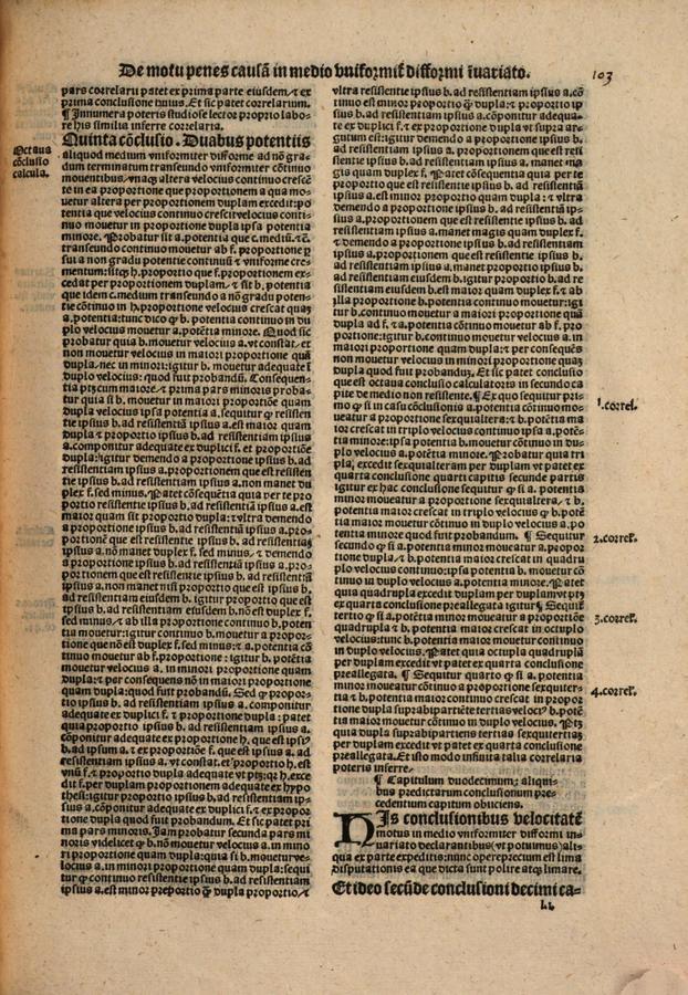 ¶ Sequitur quinto, quod numquam potentia maior potest moveri velocius minore in proportione multiplici, a qua movetur minor, nisi ipsa maior crescat continuo velocius minore in alia proportione multiplici. Patet hoc correlarium, quia sola multiplex est proportioni multiplici commensurabilis, ut patet ex sexta conclusione sexti capitis secundae partis.