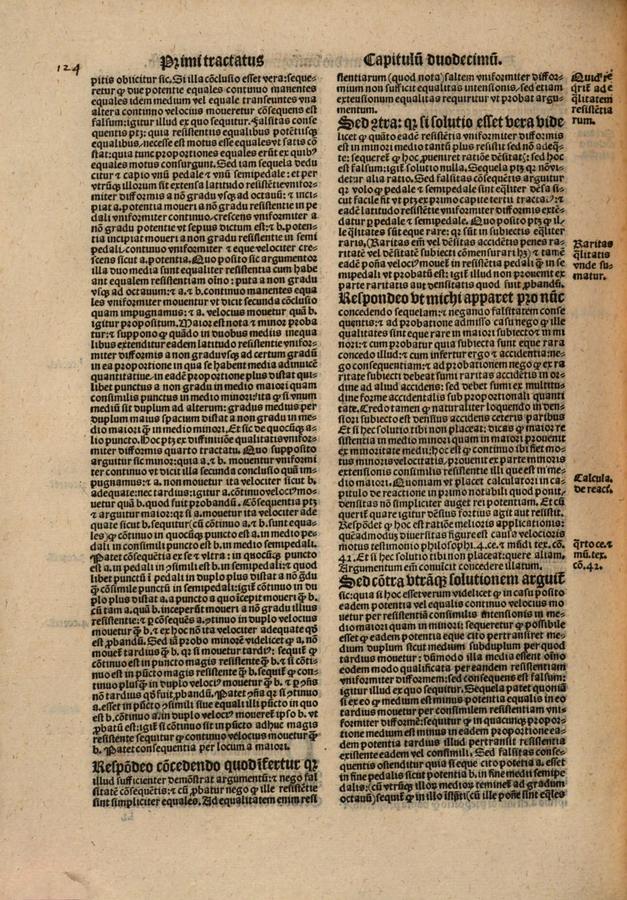 Probatur, et pono, quod A potentia ponatur in puncto initiativo C medii, quod uniformiter continuo movendo pertransit per suae potentiae a[] non gradu continuum et uniforme crementum, et in quolibet puncto intrinseco eiusdem C medii ponatur potentia una, quae uniformiter continuo a non gradu potentiae et aeque velociter sicut A crescat movendo versus extremum intensius C medii a proportione sui ad suam resistentiam. Quo posito antecedens illius consequentiae est verum, et consequens falsum, igitur correlarium verum. Quod tunc antecedens illius consequentiae est verum, patet, quia prima pars eius est ex se nota, et secunda patet ex quinta conclusione decimi capitis. Sed quod consequens sit falsum, probatur, quia si A aliquando attingit aliquam illarum potentiarum, et continuo A est aequalis cuilibet aliarum potentiarum ex hypothesi, et quaelibet aliarum potentiarum continuo intendit motum suum, sequitur, quod A aliquando intendit motum suum cum aliqua illarum potentiarum movendo ab eodem puncto cum ea continuo aeque velociter, sed consequens est falsum, ut patet ex secunda conclusione decimi capitis, igitur et antecedens. Item si A aliquando attingit aliquam illarum potentiarum, sequitur, quod eadem potentia aeque cito pertransiret totum sicut eius partem ceteris paribus, quod est impossibile, Et sic patet correlarium. ¶ Sequitur quinto, quod ad arguendum A potentiam velocius continuo moventem B potentiam praecedentem moventem tamen tardius aliquando attingere,