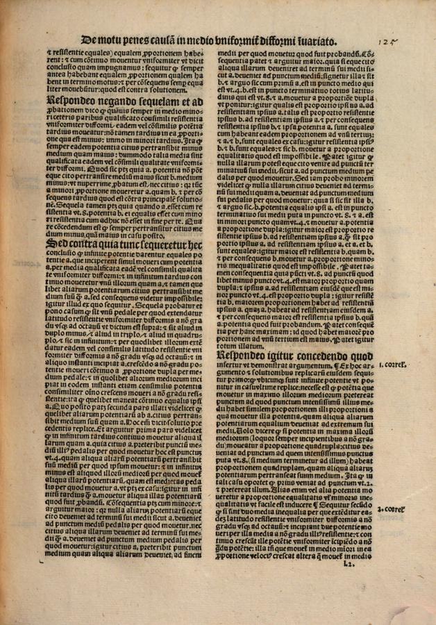 ¶ Sequitur secundo, quod potentia A, quae uniformiter continuo movetur, non potest attingere potentiam maiorem praecedentem ipsam, quae aeque velociter et uniformiter continuo intenditur sicut ipsa potentia A, de qua videlicet sit mentio in secundo correlario quintae conclusionis praeallegatae. Probatur, quia A non potest incipere moveri aeque velociter sicut illa potentia praecedens ipsam potentiam A, ergo sequitur, quod non potest attingere ipsam, quae velocius movetur et praecedit. Consequentia patet, et arguitur antecedens, quia si movebitur aliquando aeque velociter sicut maior praecedens, et illa maior praecedens continuo remittit motum suum, sequitur, quod A potentia aliquando continuo certe velocius movebitur quam illa potentia, quae continuo remittit motum suum et praecedit, et ex consequenti sequitur, quod A potentia aliquando attinget illam potentiam maiorem praecedentem (dato, quod perpetuo duraret motus illarum potentiarum in tali medio), et per consequens aeque cito pertransiretur aliquod spatium a potentia maiore et a potentia minore, quod est impossibile (ceteris deductis.) Patet consequentia, quia omne mobile sequens alterum, quod ab aliqua certa proportione continuo velocius eo movetur, (dummodo perpetuo sic moveantur), tandem attinget illud, ut facile demonstrari potet. ¶ Sequitur tertio, quod illa potentia maior praecedens continuo tardius remittit motum suum, et si perpetuo moveretur per tale medium, in infinitum tarde remitteret motum suum. Probatur hoc correlarium, quia si velocius et velocius remitteret motum suum vel uniformiter continuo, tandem deveniret ad aequalitatem motus ipsius A uniformiter continuo moventis, et tunc tardius moveretur, quod superiori correlario improbatum est. Patet igitur correlarium. ¶ Sequitur quarto, quod ista consequentia nihil valet, A in infinitum modicum distat ab aliqua istarum potentiarum, et A qualibet istarum potentiarum versus eandem differentiam continuo velocius movetur, ergo sequitur, quod A aliquando attinget al[i]quam illarum potentiarum, esto, quod perpetuo motus eius duraret.