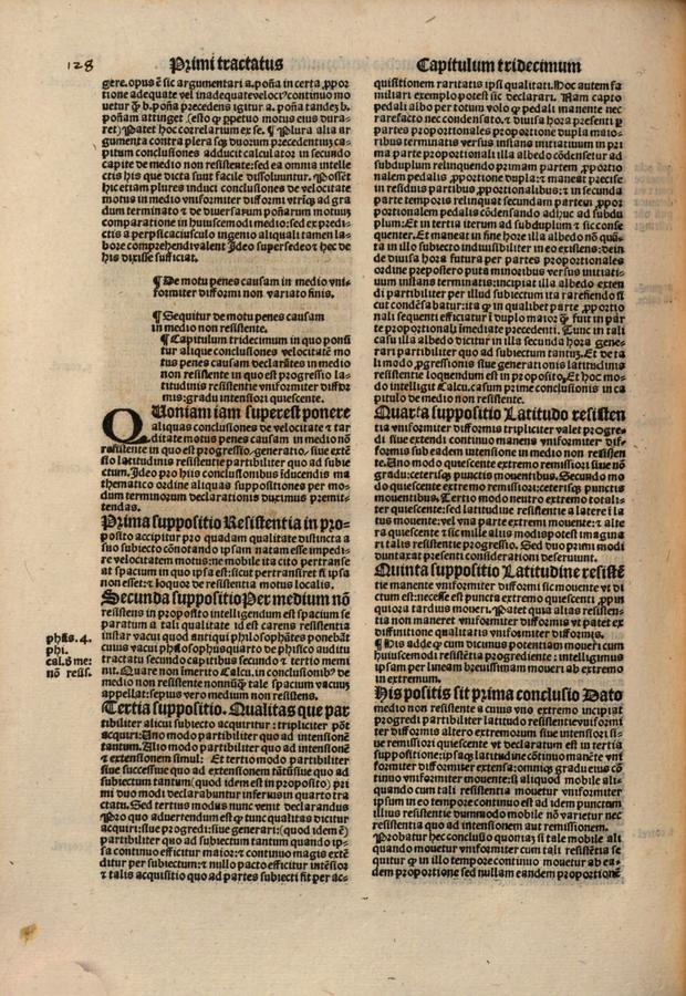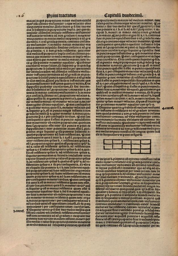 igitur transeundo secundam medietatem non movetur ab F proportione, ergo non movetur continuo uniformiter. Quod fuit probandum. Consequentia patet ex secundo correlario quintae conclusionis secundi capitis secundae partis. Nam quod ibi dicitur de rationalibus quantitatibus de quibuscumque ex eadem quinta conclusione facile demonstrari valet. Et sic patet correlarium. ¶ Et ex hoc habes documentum notandum, quod praedictae conclusiones duorum praecedentium capitum intelliguntur, cum potentiae moventur in medio uniformiter difformi perfecte quadrato vel quadrilatero uniformis latitudinis et profunditatis continuo. ¶ Utrum autem talia media requirantur ad praedictas conclusiones verificandas, ita quod cum nullis aliis mediis potentiae possint moveri secundum tenorem praedictarum conclusionum quam cum illis, tu ipse inquiras.