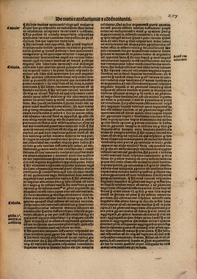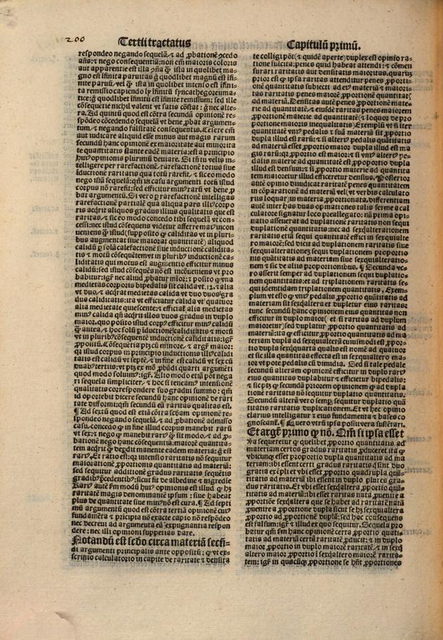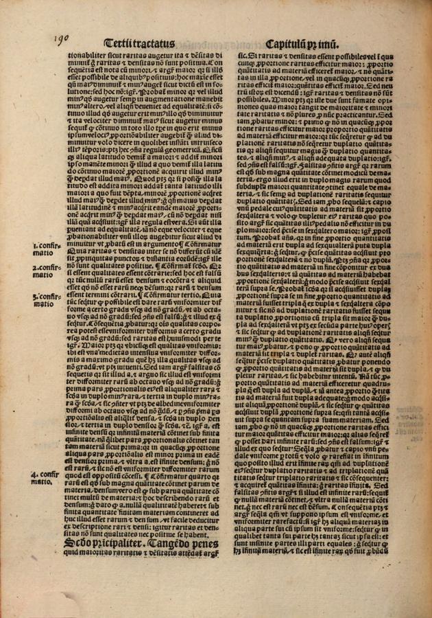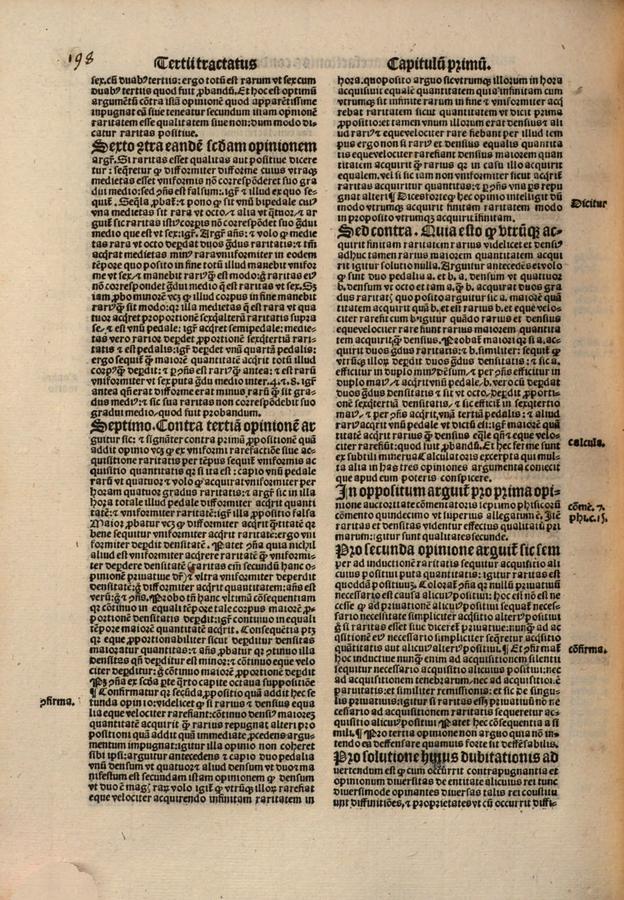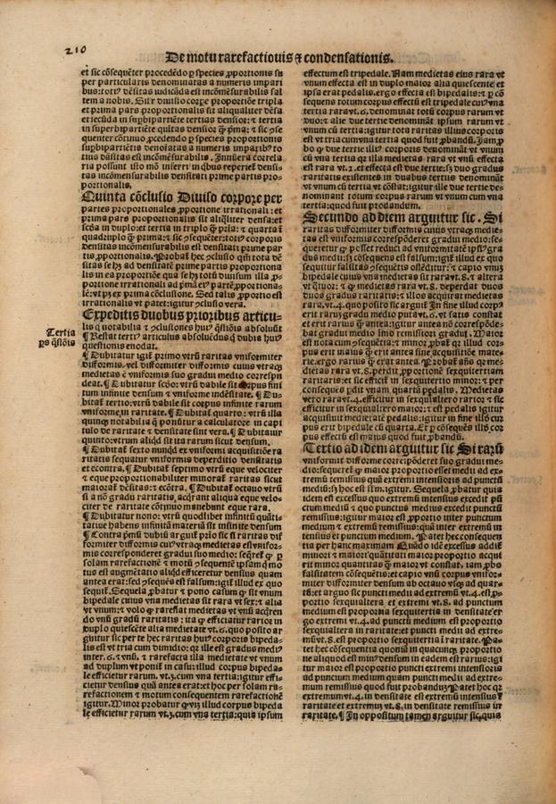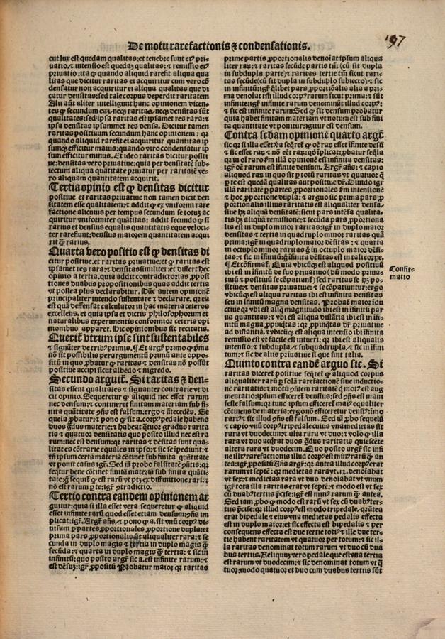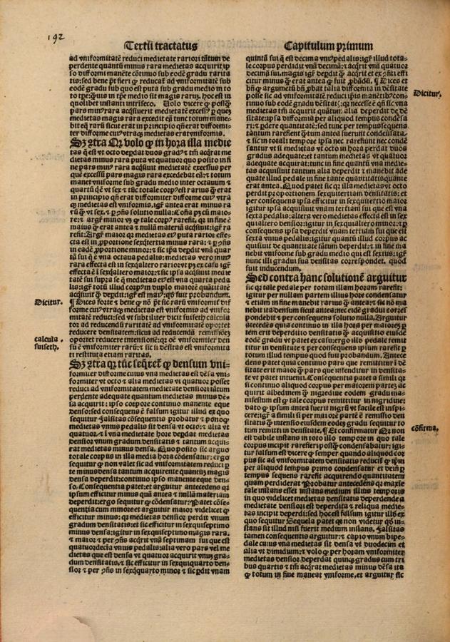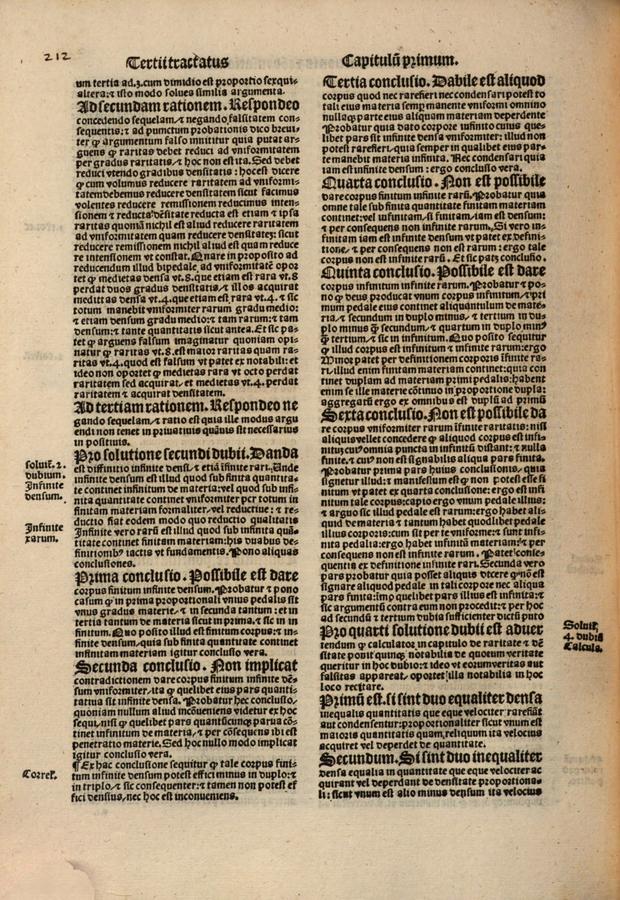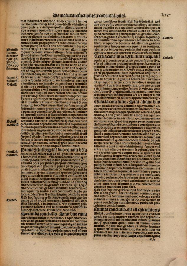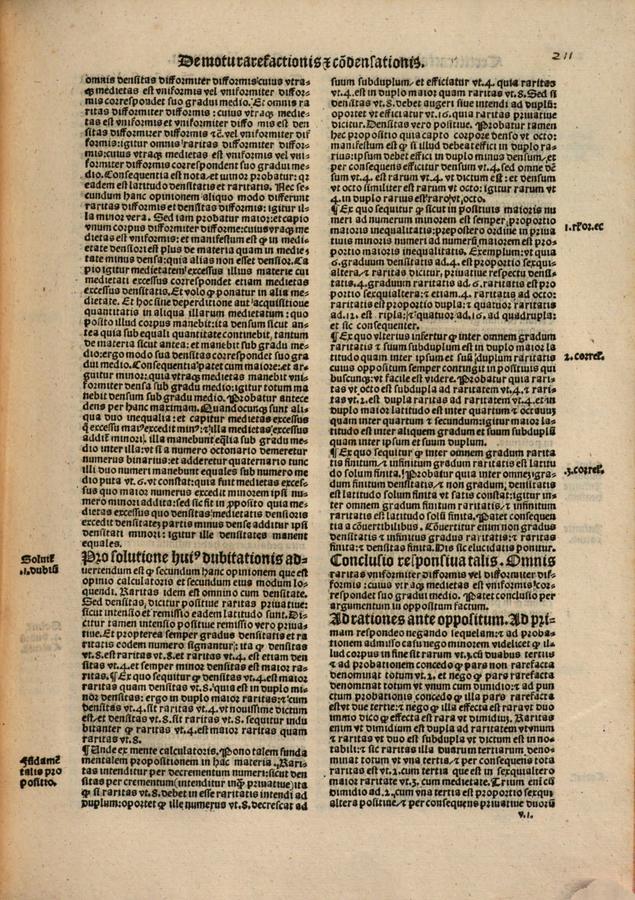 ¶ Dubitatur igitur primo, utrum raritas uniformiter difformis vel difformiter difformis, cuius utraque medietas est uniformis, suo gradui medio corresp[o]ndeat. ¶ Dubitatur secundo, utrum dabile sit corpus finitum infinite densum et uniforme in densitate. ¶ Dubitatur tertio, utrum dabile sit corpus infinite rarum uniforme in raritate. ¶ Dubitatur quarto, utrum illa quinque notabilia, quae ponuntur a calculatore