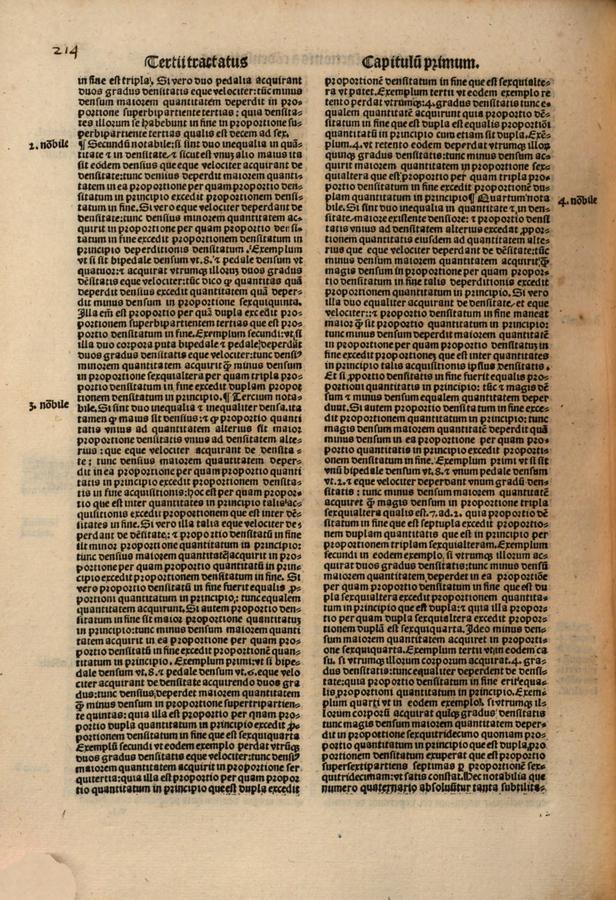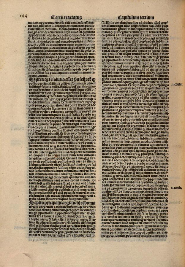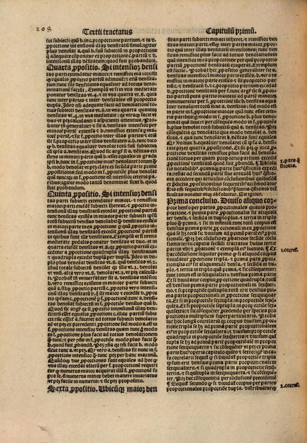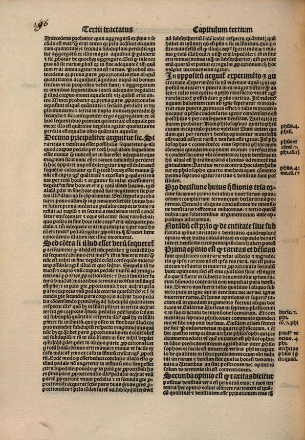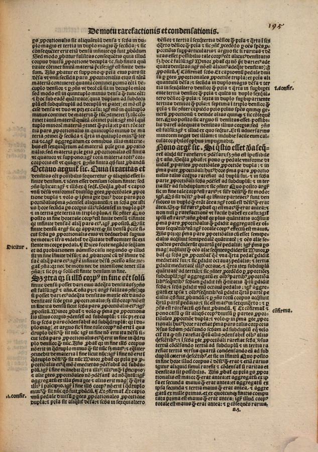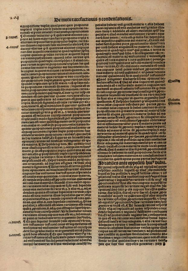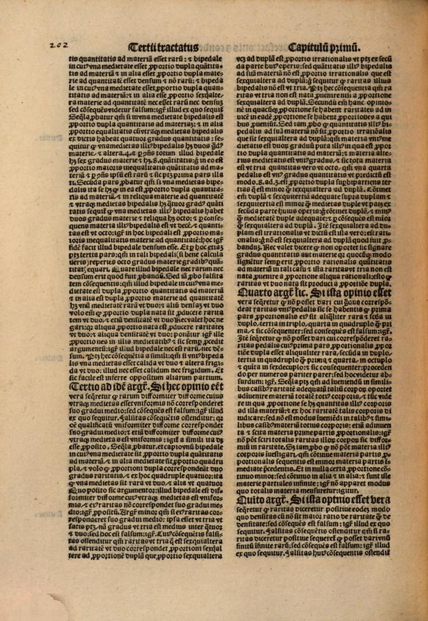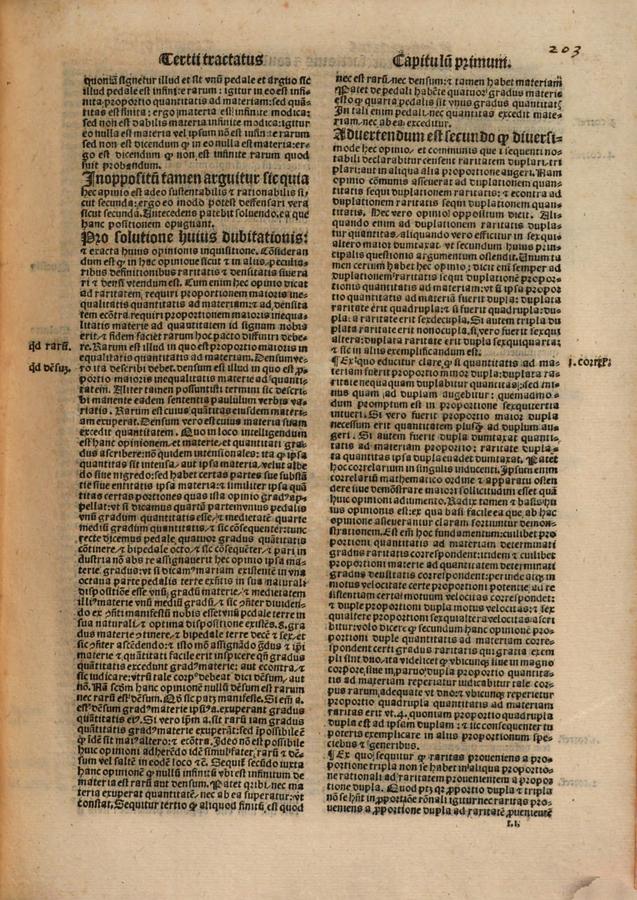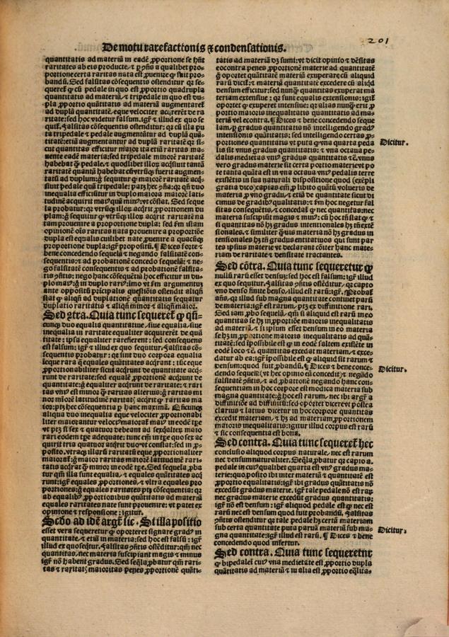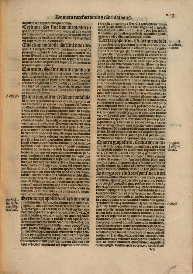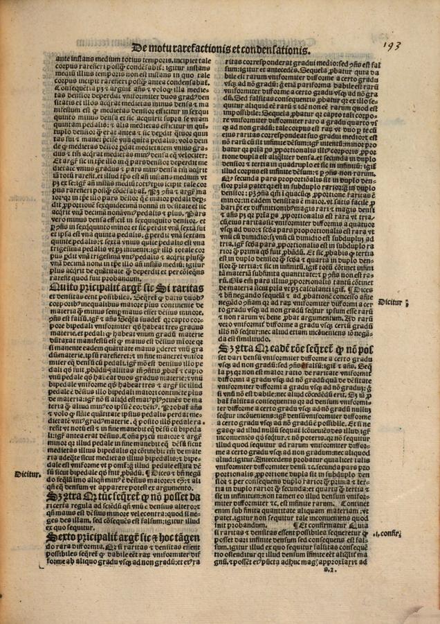 ¶ Dubitatur igitur primo, utrum raritas uniformiter difformis vel difformiter difformis, cuius utraque medietas est uniformis, suo gradui medio corresp[o]ndeat. ¶ Dubitatur secundo, utrum dabile sit corpus finitum infinite densum et uniforme in densitate. ¶ Dubitatur tertio, utrum dabile sit corpus infinite rarum uniforme in raritate. ¶ Dubitatur quarto, utrum illa quinque notabilia, quae ponuntur a calculatore