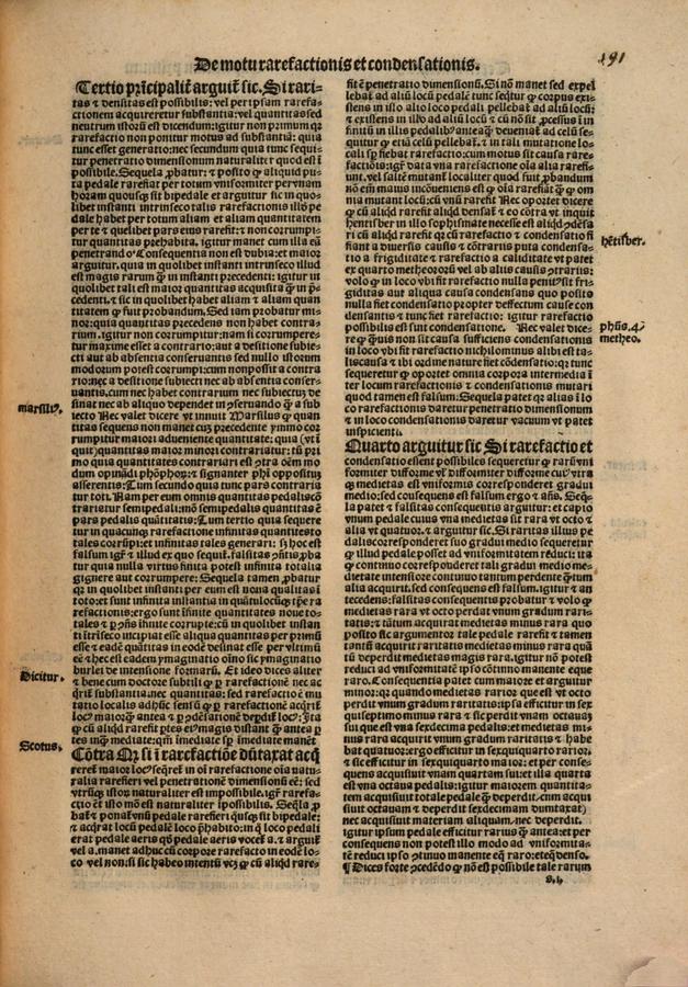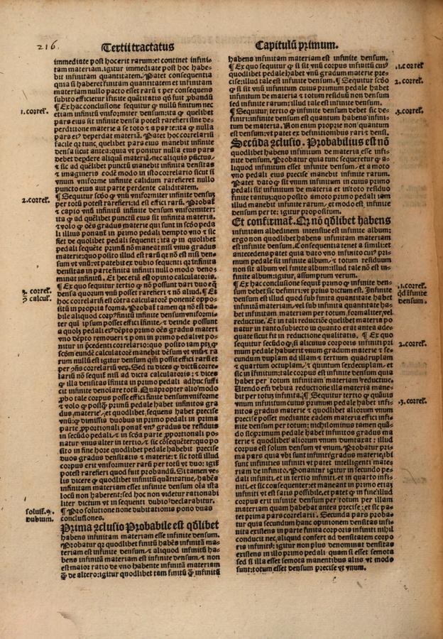 immediate post hoc erit rarum et continet infinitam materiam. Igitur immediate post hoc habebit infinitam quantitatem. Patet consequentia, q[u]ia, si haberet finitam quantitatem et infinitam materiam, nullo pacto esset rarum, et per consequens subito efficietur infinitae quantitatis. Quod fuit probandum. ¶ Ex hac conclusione sequitur, quod nullum finitum nec etiam infinitum uniformiter densum, ita quod quaelibet pars eius sit infinite densa, potest rarefieri sine deperditione materiae a se toto et a parte, ita quod nulla pars eius deperdat materiam. Patet hoc correlarium facile, quia tunc quaelibet pars eius manebit infinite densa sicut antea, quia – ut ponitur – nulla eius pars debet deperdere aliquam materiam, nec aliquis punctus, et sic ad quemlibet punctum manebit infinita densitas, et imagineris eodem modo in isto correlario, sicut si unum uniforme infinite calidum rarefieret nullo puncto eius aut parte perdente caliditatem.