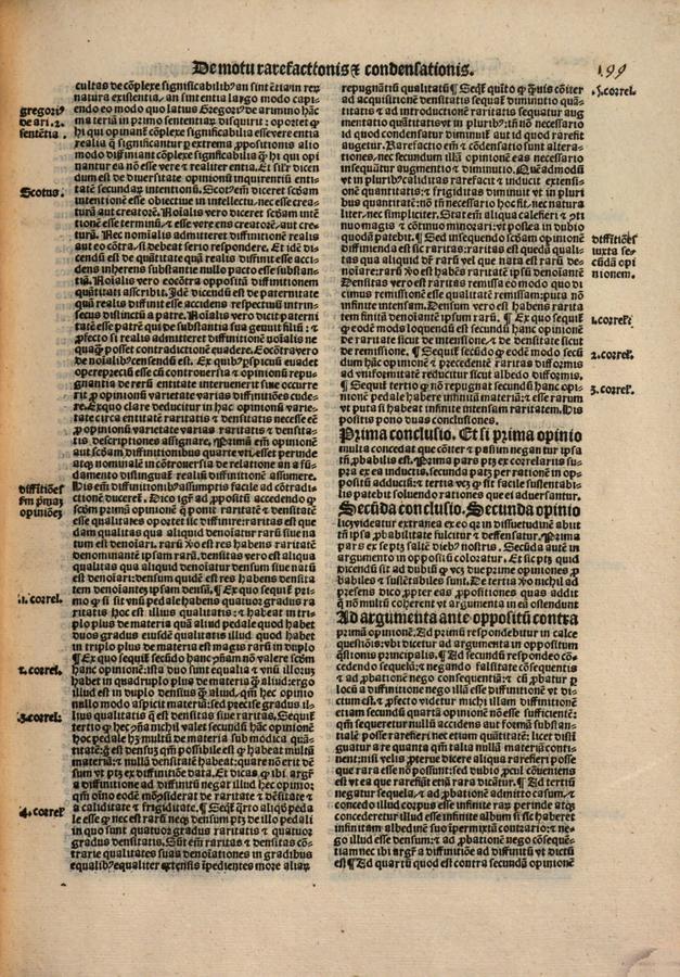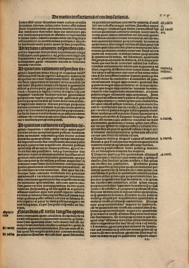 ¶ Ad rationes ante oppositum: ad primam duplicit[e]r respondeo primo secundum opinionem recitatam in primo notabili, quae tenet, quod dicuntur positive, et sunt qualitates, et cum probatur, quod non, quia aeque velociter et aeque proportionabiliter, sicut densitas augetur, ita raritas diminuitur, igitur raritas et densitas non dicuntur positive, negatur antecedens secundum hanc opinionem, et etiam aliqui negant idem antecedens secundum alteram, quorum princeps est calculator