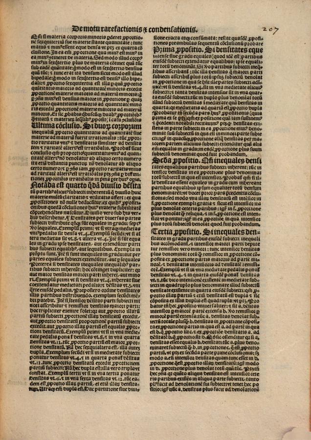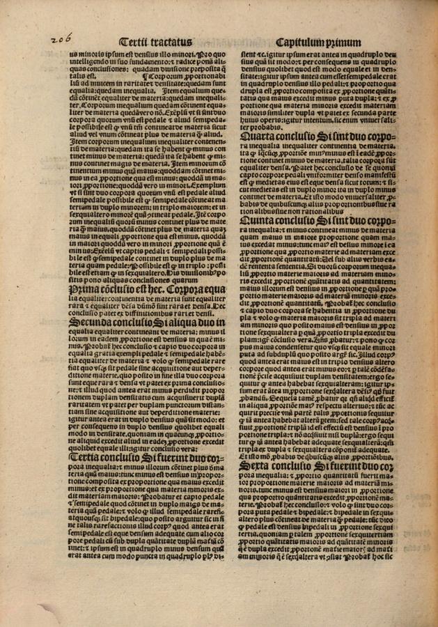 minoris, ipsum est densius illo minori. Pro quo intelligendo in suo fundamento et radice potentia aliquas conclusiones quadam divisione praeposita, quae talis est: ¶ Corporum proportionabilium ad invicem in raritate et densitate quaedam sunt aequalia, quaedam inaequalia. Item aequalium quaedam continent aequaliter de materia, quaedam inaequaliter. Corporum inaequalium quaedam continent aequaliter de materia, quaedam vero non. Exemplum, ut si sint duo corpora, quorum unum est pedale, et aliud semipedale, possibile est, quod unum tantum contineat de materia sicut aliud, vel unum contineat plus de materia quam aliud. Item corporum inaequalium inaequaliter contenentium de materia, quaedam ita se habent, quod minus continet minus de materia, quaedam ita se habent, quod minus continet magis de materia. Item minorum continentium minus quam maius, quoddam continet minus in ea proportione, qua est minus, quoddam in maiori proportione, quoddam vero in minori. Exemplum, ut si sint duo corpora, quorum unum est pedale, aliud semipedale, possibile est, quod semipedale contineat materiam in duplo minorem, in triplo maiorem et in sexquialtero minorem, quam contineat pedale. Item corporum inaequalium, quorum minus continet plus de materia quam maius, quoddam continet plus de materia quam maius in aequali proportione, qua est minus, quoddam in maiori, quoddam vero in minori proportione, quam est minus. Ex[emp]lum, ut captis pedali et semipedali possibile est, quod semipedale continet in duplo plus de materia quam pedale. Possibile est, quod in triplo, possibile est etiam, quod in sexquialtero. His divisionibus positis pono aliquas conclusiones, quarum: