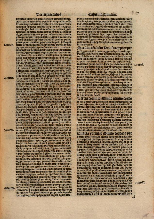 et sic consequenter procedendo per species proportionis superparticularis denominatas a numeris imparibus, totius densitas iudicanda est incommensurabilis saltem a nobis. Similiter divisio corpore proportione tripla et prima pars proportionalis sit aliqualiter densa, et secunda in superbipartiente tertias densior, et tertia in superbipartiente quintas densior quam prima et sic consequenter continuo procedendo per species proportionis superbipartientis denominatas a numeris imparibus, totius d[en]sitas est incommensurabilis. Innumera correlaria possunt isto modo inferri, in quibus reperietur densitas incommensurabilis densitati primae partis proportionalis.