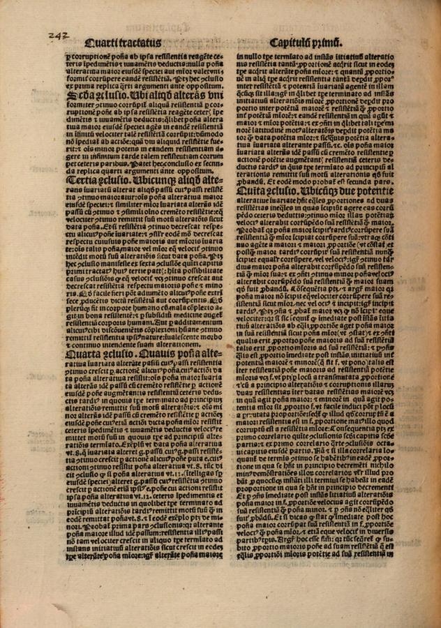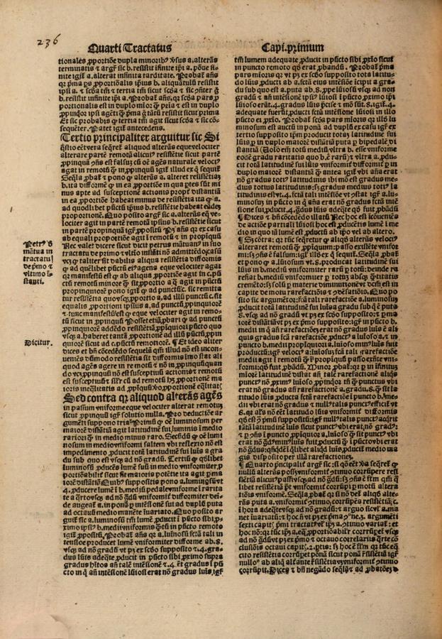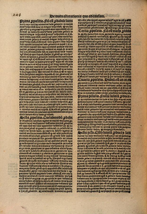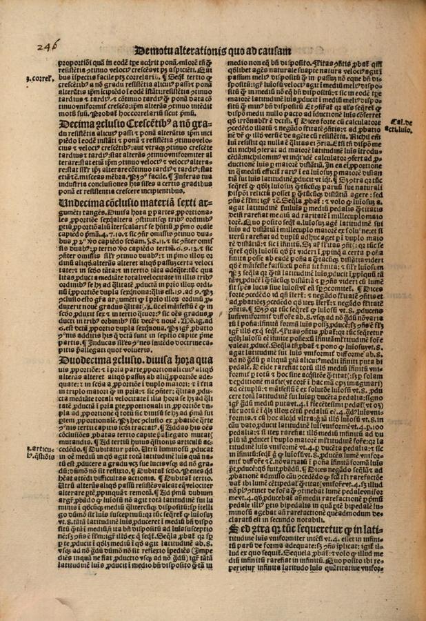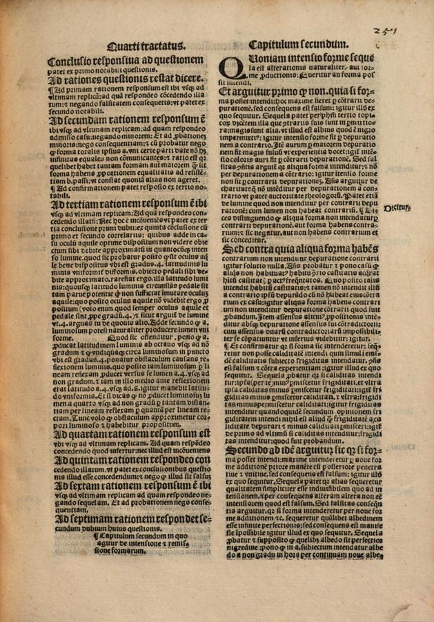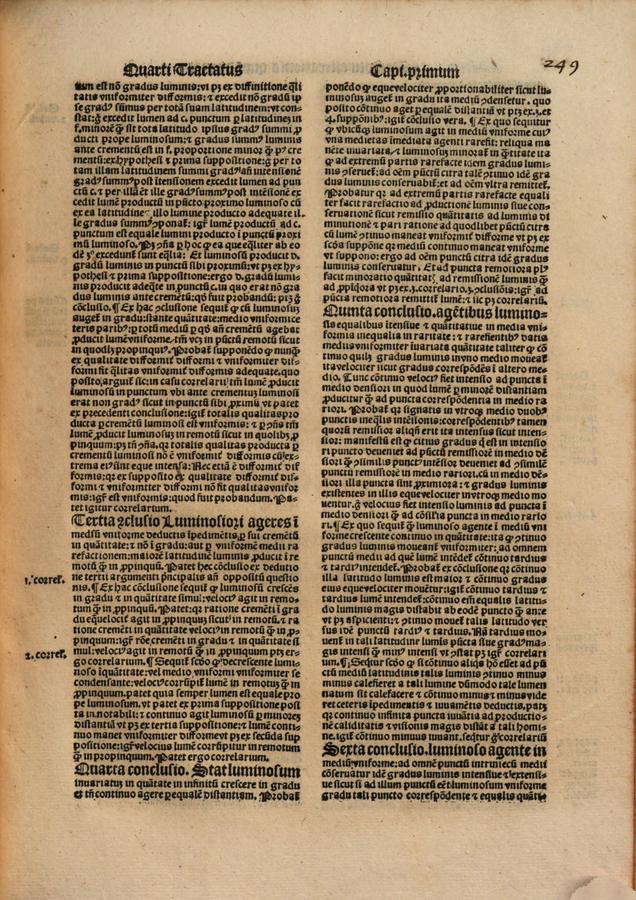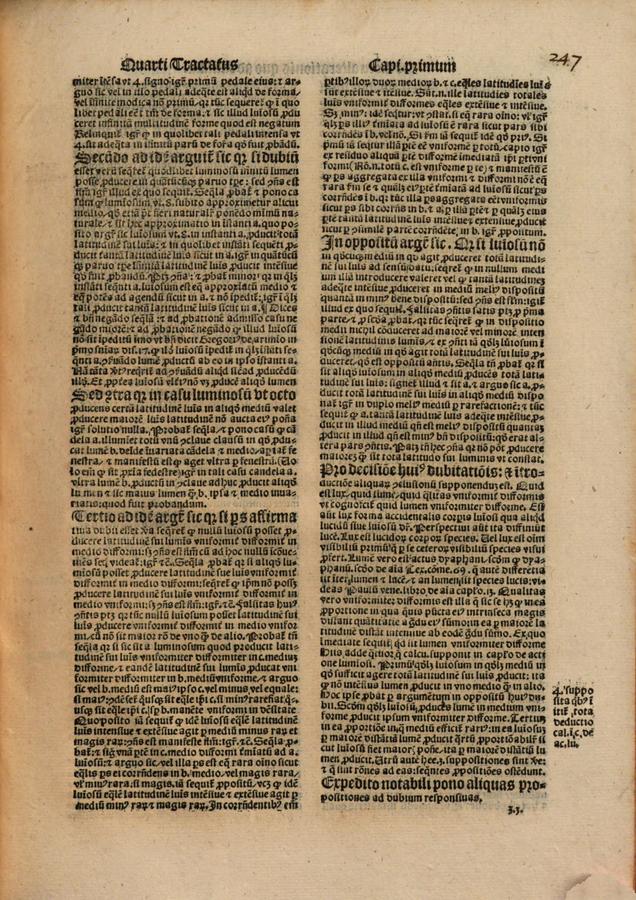 Quarta propositio: dubium est, an in ea proportione, qua luminosum efficitur intensius in forma, in ea agat per maiorem distantiam medio uniformi existente. Ad hoc enim non video rationem nec ad oppositum et cetera. ¶ His tamen non obstantibus admissis illis quatuor suppositionibus positis in notabili infero aliquas conclusiones de mente calculatoris
