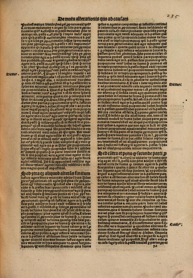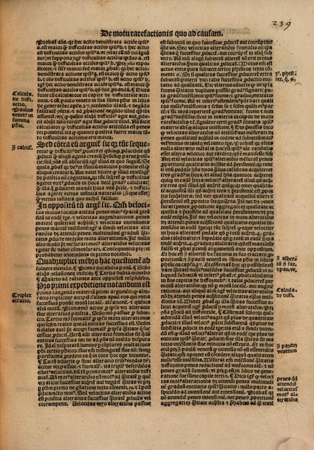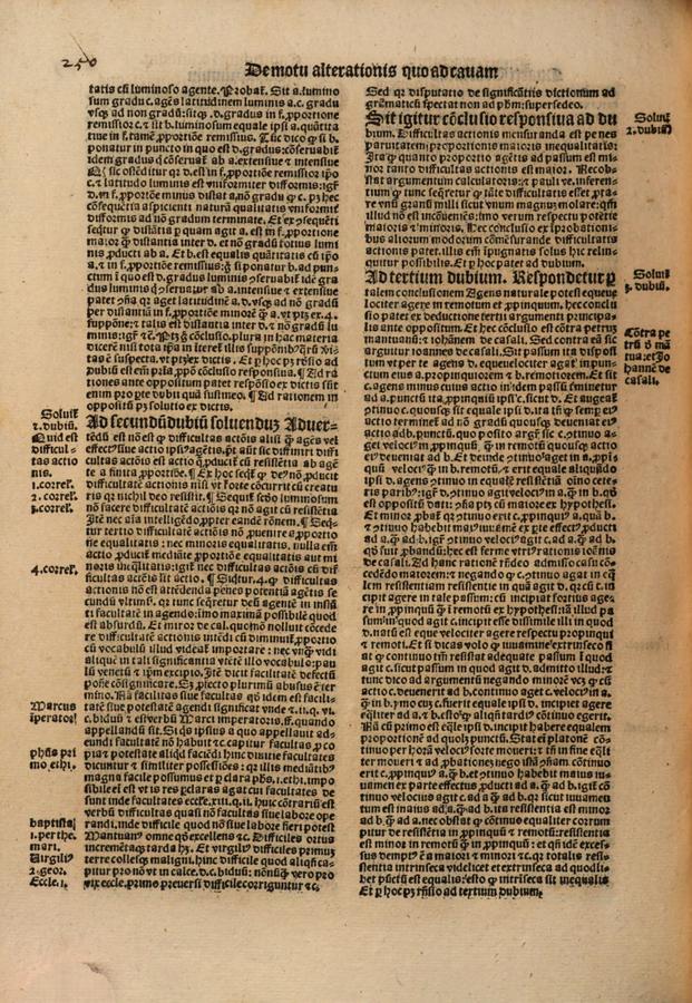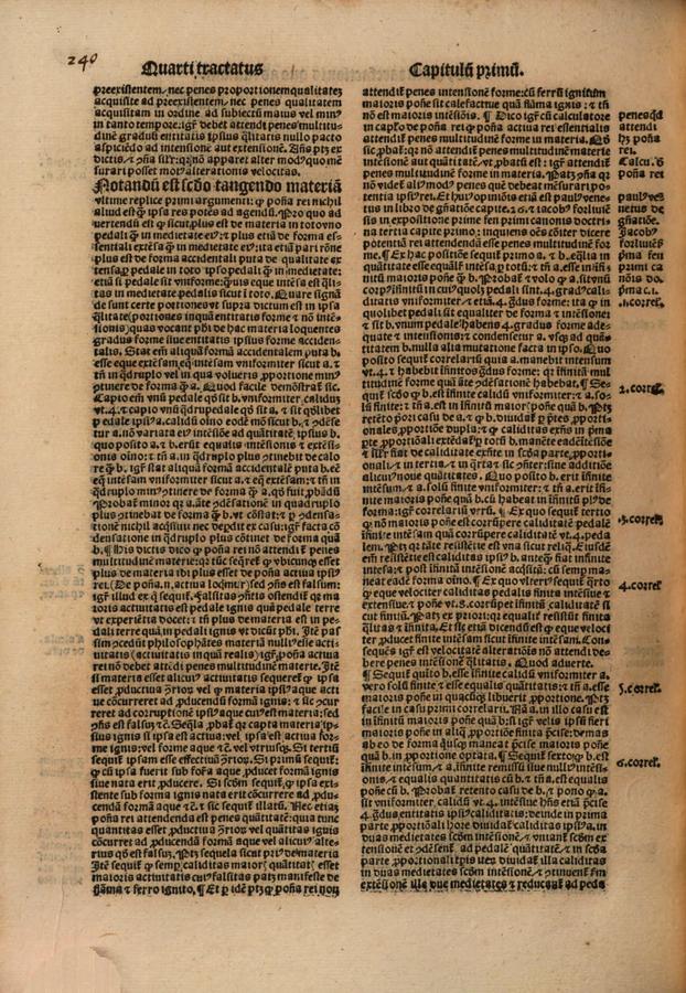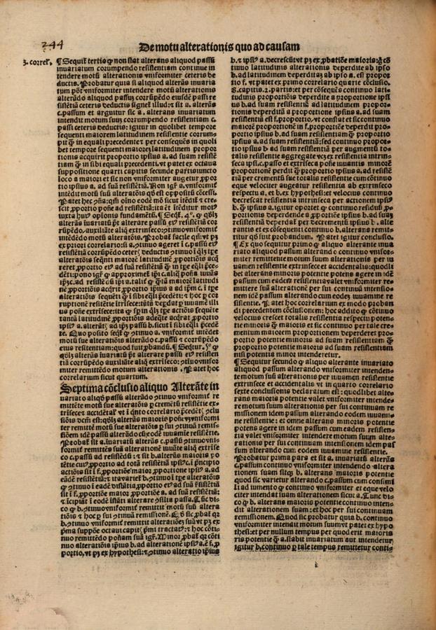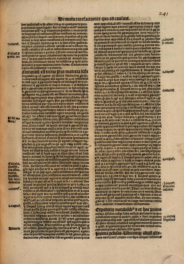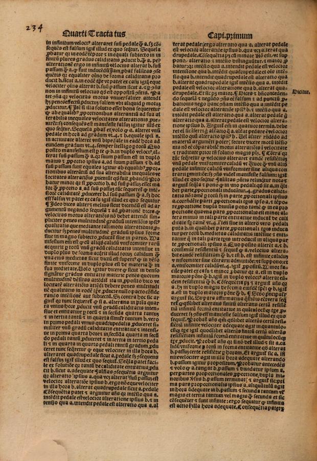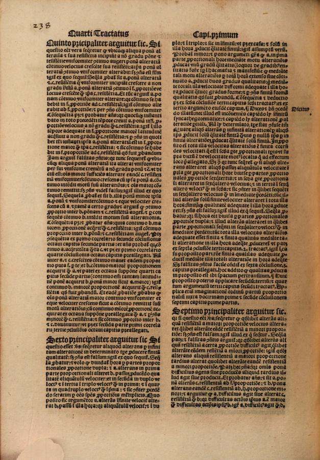 Quarta propositio: dubium est, an in ea proportione, qua luminosum efficitur intensius in forma, in ea agat per maiorem distantiam medio uniformi existente. Ad hoc enim non video rationem nec ad oppositum et cetera. ¶ His tamen non obstantibus admissis illis quatuor suppositionibus positis in notabili infero aliquas conclusiones de mente calculatoris