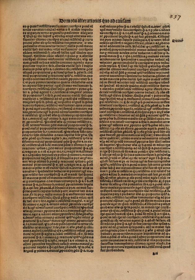 uniformiter intendendo alterationem suam. Quod fuit probandum Probatur prima pars minoris, si per aliquod tale tempus, per quod videlicet B est maioris potentiae quam A, stat B invariatum. Sequitur, quod per illud tempus maiorem proportionem acquirit per decrementum totius resistentiae proportio ipsius B ad suam resistentiam quam proportio ipsius A ad suam resistentiam, cum continuo tota resistentia ipsius B sit minor quam tota resistentia ipsius A, cum in principio fuerunt aequales, et velocius continuo agit B corrumpendo resi[sten]tiam suam quam A, et ex consequenti sequitur, quod in tali tempore B velocius intendit suam alterationem quam A, quod est contra hypothesim. Eodem modo probatur secunda pars minoris auxiliante loco a maiori. Et sic patet prima pars correlarii. Secunda vero probatur eodem modo paucis mutatis.