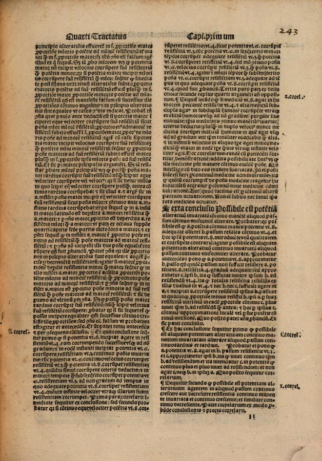 principio alterationis, efficiretur in F proportione maior proportione minoris potentiae ad minorem resistentiam vel maior quam in F proportione maior, sed istud consequens est falsum, igitur illud, ex qu[o] sequitur. Sed iam probo minorem videlicet, quod potentia maior non incipit velocius corrumpere suam resistentiam quam potentia minor, quia si potentia maior incipit velocius corrumpere suam resistentia quam minor, sequitur, quod immediate post instans initiativum alterationis subito proportio maioris potentiae ad suam resistentiam efficitur plus quam in F proportione maior proportione minoris potentiae ad minorem resistentiam, quod est manifeste falsum, cum successive illae proportiones continuo augeantur, et [in] principio alterationis sint aequales, ut casus conclusionis indicat. Probatur tamen consequentia, quia – ut paulo ante deductum est – si potentia maior inciperet aeque velociter corrumpere suam resistentiam sicut potentia minor minorem resistentiam, proportio eius ad maiorem resistentiam subito efficentur in F proport[i]one maior proportione minoris potentiae ad minorem resistentiam. Igitur cum casu si potentia maior incipit velocius corrumpere suam resistentiam, quam potentia minor minorem resistentiam, sequitur, quod proportio potentiae maioris ad suam resistentiam subito efficitur maior plus quam in F proportione ipsa minoris potentiae ad suam resistentiam. Et sic patet maior principalis argumenti. Sed iam resistat probare minorem principalem, videlicet quod postquam potentia maior tardius corrumpit suam resistentiam, numquam incipiet aeque velociter corrumpere vel velocius, quia si sic, detur instans, in quo incipit aeque velociter corrumpere, postquam antea continuo tardius corrumpebat, et sit illud A, et arguitur sic: in A instanti potentia maior incipit aeque velociter corrumpere suam resistentiam sicut potentia minor, et conti[n]uo ante A instans tardius corrumpebat, ergo sequitur, quod in A instanti maior latitudo est deperdita A minori resistentia quam A maiori, et per consequens maior proportio est deperdita A resistentia minori quam a maiori, ut patet ex octava suppositione quarti capitis secundae partis iuncto loco a maiori, et ex consequenti sequitur, quod in instanti A maior est proportio potentiae minoris ad resistentiam quam potentiae maioris ad maiorem resistentiam, et per consequens non incipiunt illae duae potentiae aequaliter corrumpere. Quod fuit probandum. Patet consequentia, quia illae proportiones in principio alterationis sunt aequales, et augentur praecise per decrementum resistentiarum, igitur si maiorem proportionem deperdit resistentia minor quam maior, sequitur, quod in illo instanti A maior proportio est acquisita proportioni potentiae minoris ad minorem resistentiam quam proportioni potentiae maioris ad maiorem resistentiam, et per consequens sequitur, quod in instanti A maior est proportio potentiae minoris ad suam resistentiam quam potentiae maioris ad maiorem resistentiam, et sic de primo ad ultimum patet consequentia. Sed quod postquam potentia maior tardius corrumpit suam resistentiam, numquam incipit velocius suam resistentiam corrumpere, probatur, quia si sic, sequeretur, quod posset incipere aequaliter, quam successive continuo crescunt illae proportiones, sed consequens est falsum, ut probatum est, igitur et antecedens. Et sic patet totum antecedens, et per consequens conclusio. ¶ Ex qua conclusione sequitur primo, quod si potentia ut 8 incipiat agere in resistentiam ut 4 eam corrumpendo successive usque ad non gradum, et in eodem instanti incipiat potentia ut 6 corrumpere resistentiam ut 3 continuo potentiis invariatis, tunc potentia ut 6 continuo velocius corrumpet resistentiam ut 3, quam potentia ut 8 corrumpet resisteniam ut 4, quamdiu simul corrumpent, ceteris deductis, et in minori tempore quam subsesquitertio corrumpet potentia ut 6 resistentiam ut 3 ad non gradum ad tempus, in quo adaequate potentia ut 8 corrumpet resistentiam ut 4, quamvis infinite velociter utraque illarum suam resistentiam corrumpet. Prima pars correlarii immediate sequitur ex conclusione, sed secunda probatur, quia si continuo aeque velociter potentia ut 8 corrumperet | resistentiam ut 4, sicut potentia ut 6 corrumpit resistentia ut 3, tunc potentia ut 6 in sesquitertio minori tempore corrumpe[]t adaequate resistentiam ut 3, quam potentia ut 8 corrumperet resistentiam ut 4, sed modo continuo potentia [ut] 6 velocius corrumpit resistentiam ut 3 quam potentia ut 8 resistentiam ut 4, igitur in minori tempore quam subsesquitertio potentia ut 6 corrumpit resistentiam ut 3 adaequate ad tempus, in quo adaequate potentia ut 8 corrumpit resistentiam ut 4. Quod fuit probandum. Tertia pars patet ex deductione secundae replicae quarti argumenti ante oppositum. ¶ Sequitur secundo, quod si medicina ut 8 agat in humorem peccantem resistentiae ut 4, et alia medicina subdupla agat in subduplum humorem corrumpente utraque malitiam humoris usque ad non gradum vel purgante sive evacuante, ipsis medicin[i]s continuo manentibus invariatis, ceteris deductis, plus quam in duplo velocius minor medicina corrumpet malitiam humoris, in quem agit, usque ad non gradum aut ipsum totaliter evacuabit quam alia, et in infinitum velocius in aliquo tempore aget minor medicina quam maior in eodem tempore, quamvis utraque infinite velociter agit. Hoc correlarium eandem cum praecedenti sortitur demonstrationem addita possibilitate huius, videlicet quod illae medicinae possunt manere continuo eiusdem potentiae. Quod intelligo, cum dico eas manere invariatas. Id enim possibile est fieri per continuam medicinae administrationem, ita quod quantum corrumpitur de potentia medicinae reagente humore, tantum acquiratur per continuam novae medicinae administrationem aut (quod facilius est) per continuam aliarum partium actuationem. Non enim subito nec simul ipsa tota medicina actuatur.