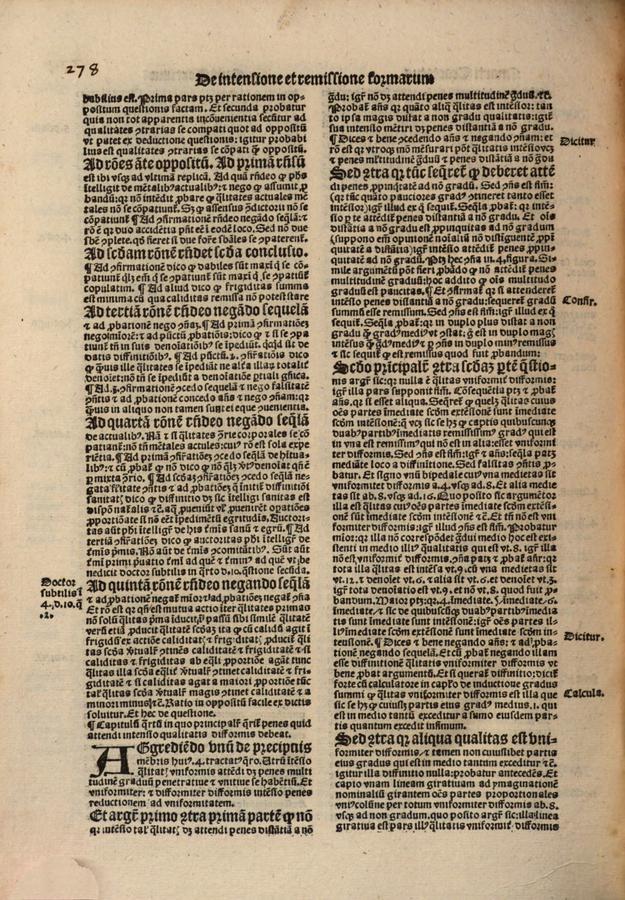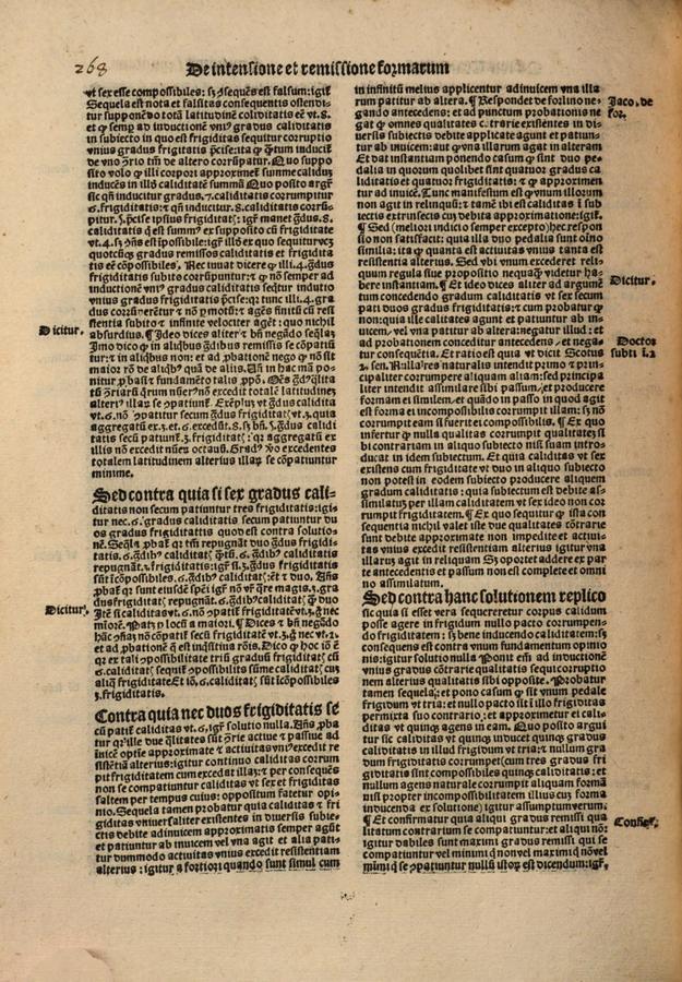 ut sex esse compossibiles, sed consequens est falsum, igitur. Sequela est nota, et falsitas consequentis ostenditur supponendo totam latitudinem c[a]liditatis esse ut 8, et quod semper ad inductionem unius gradus caliditatis in subiecto, in quo est frigiditas, sequitur corruptio unius gradus frigitatis praecise, ita quod quantum inducitur de uno contrario, tantum de altero corrumpatur. Quo supposito volo, quod illi corpori approximetur summae calidum inducens in illud caliditatem summam. Quo posito arguitur sic, quando inducitur gradus 7 caliditatis, corrumpitur 6 frigiditatis, et quando inducitur 8 caliditatis, corrumpitur 5 praecise ipsius frigiditatis, igitur manet gradus 8 caliditatis, qui est summus ex supposito cum frigiditate ut 4, sed consequens est impossibile, igitur illud, ex quo sequitur, ubicumque quotcumque gradus remissos caliditatis et frigiditatis esse compossibiles. Nec iuvat dicere, quod illi 4 gradus frigiditatis subito corrumpuntur, et quod non semper ad inductionem unius gradus caliditatis sequitur indu[c]tio unius gradus frigiditatis praecise, quia tunc illi 4 gradus corrumperentur, et non per motum, et agens finitum cum resistentia subito et infinite velociter agent, quo nihil absurdius. ¶ Ideo dices aliter et bene negando sequelam. Immo dico, quod in aliquibus gradibus remissis se compatiuntur et in aliquibus non, [...] Unde in hac m[ateria] ponitur pro basi et fundamento talis propositio: omnes gradus qualitatum contrariarum, quorum numerus non excedit totalem latitudinem alterius illarum, se compatiuntur. Exemplum: ut gradus calidita ut 6 non compatitur secum gradus frigiditatis ut 3, quia aggregatum ex 3 et 6 excedunt 8, sed bene 5 gradus caliditatis secum patiuntur 3 frigiditatis, quia aggregatum ex illis non excedit numerum octavum. Gradus vero excedentes totalem latitudinem alterius illarum se compatiuntur minime.