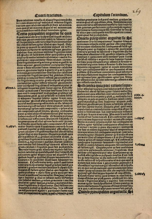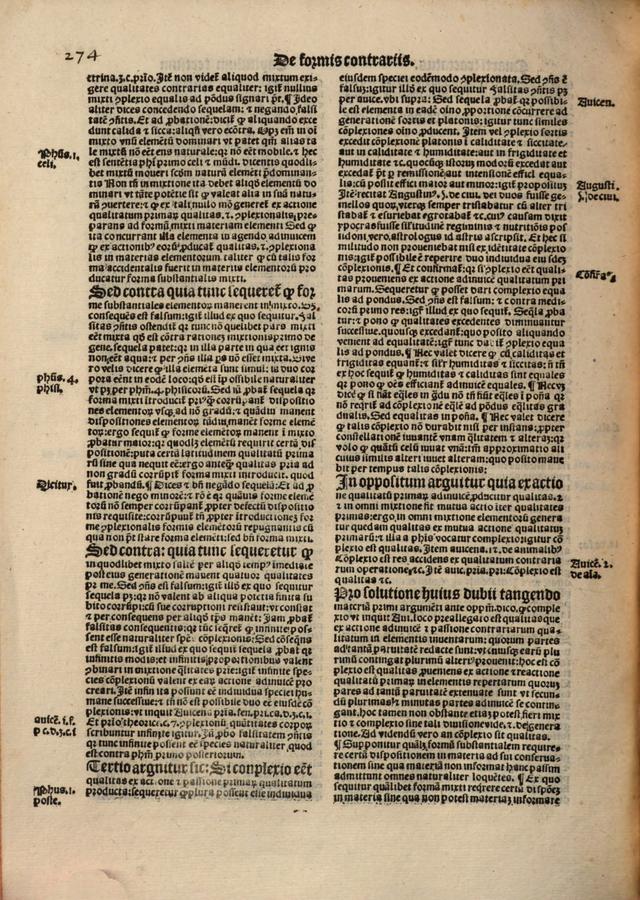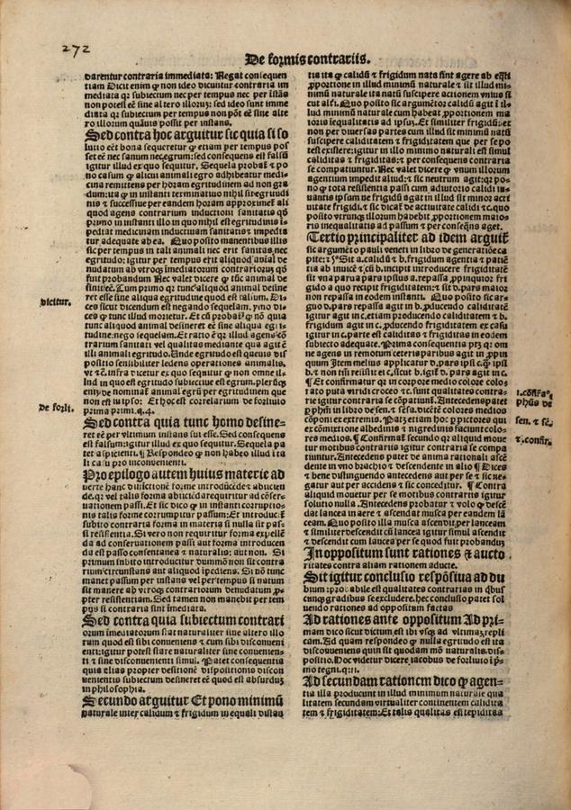 Et arguitur primo, quod non auctoritate beati Augustini in libro enchiridion capite 17. dicentis: nullus cibus simul dulcis est et amarus, nullum corpus ubi album, ibi nigrum est. Et exemplicat de aliis contrariis volens probare contraria eidem inesse non posse, igitur de intentione beati Augustini est contraria se compari minime. ¶ Secundo auctoritate philosophi in praedicamento quantitatis dicentis: nihil est, quod videatur simul contraria suscipere. Et per hoc vult probare, quod contraria non possunt simul eidem inesse, et exemplificat de albo et nigro, igitur illud est de mente eius. ¶ Tertio auctoritate eiusdem philosophi primo physicorum tex[tu] 9., 20., ubi dicit contra Anaxagoram ponentem unum contrarium fieri ex altero, quod contraria possunt esse in eodem in potentia, sed non in actu simul, igitur illud est de intensione philosophi. ¶ D[i]ces et bene ad omnes has auctoritates distinguendo, quod contraria non possunt esse simul in eodem, aut capiendo ly „contraria“ primo intentionaliter et similiter ly „esse in eodem“, et sic negatur, aut secund[o] intentionaliter pro terminis contrariis et predicari accidentaliter, et sic concedo contraria non posse esse naturaliter in eodem subiecto. Quod beatus Augustinus subtiliter innuit, cum inquit. Nullum corpus, ubi est album, ibi nigrum est. Et haec est intentio eius. Similiter philosophus in praedicamento quantitatis loquitur de contrarietate secundo intentionaliter. Vult enim loco praeallegato probare, quod magnum et parvum non sunt termini contrarii, dicens, quod termini contrarii non possunt simul de eodem verificari, parvum vero et magnum de eo verificantur. Et sic intelligitur eius auctoritas, ubicumque de hac materia loquitur.
