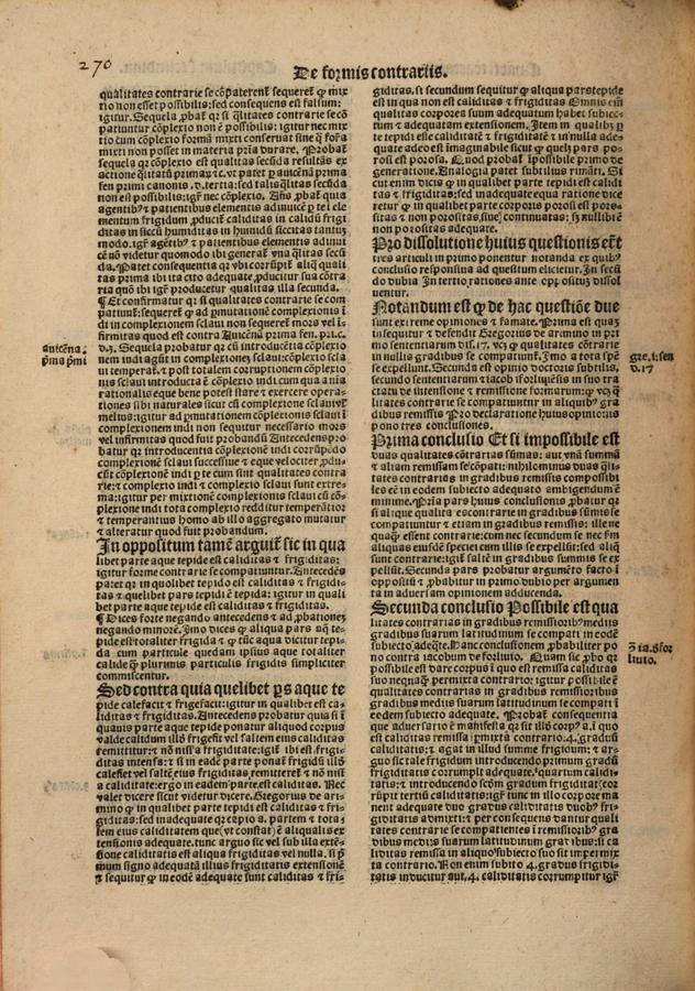 Notandum est, quod de hac quaestione duae sunt extremae opiniones et famatae. Prima est, quam insequitur et defendit Gregorius de Arimino in primo sententiarum, dis[positione] 17., videlicet quod qualitates contrariae in nullis gradibus se compatiuntur. Immo a tota specie se expellunt. Secunda est opinio doctoris subtilis, secundo sententiarum et Iacobi Forliviensis in suo tractatu de intensione et remissione formarum, quod videlicet qualitates contrariae se compatiunt[u]r in aliquibus gradibus remissis. Pro declaratione huius opinionis pono tres conclusiones.