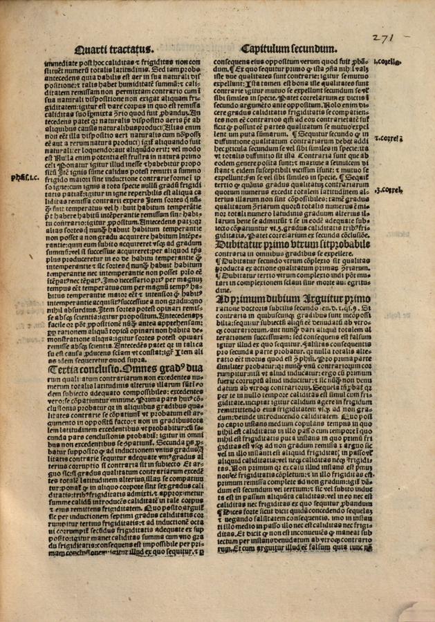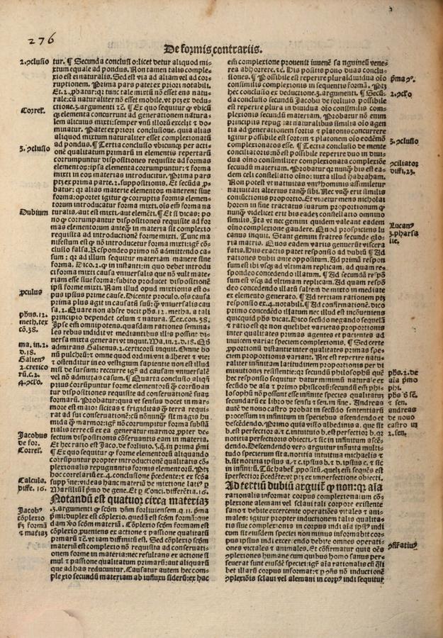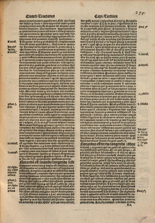 ¶ Secunda conclusio: licet detur aliquod mixtum aequale ad pondus. Non tamen talis complexio est ei naturalis. Sed est via ad aliam vel ad corruptionem. Prima pars patet ex priori notabili. Et 2. probatur, quia tunc tale mixtum non esset ens naturale, cum naturaliter non esset mobile, ut patet ex deductione 3. argumenti et cetera. ¶ Ex quo sequitur, quod ubicumque elementa concurrunt ad generationem naturalem alicuius mixti, semper unum illorum excelit et dominatur. Patet ex priori conclusione, quia alias aliquod mixtum naturaliter esset complexio natum ad pondus. ¶ Tertia conclusio: ubicumque per actionem qualitatum primarum in elementis repertarum corrumpuntur dispositiones requisitae ad formas elementorum, ipsa elementa corrumpuntur, et forma mixti in eorum materias introducitur. Prima pars patet ex prima parte 2. suppositionis. Et secunda probatur, quia alias materiae elementorum manerent sive forma, oportet igitur, quod corruptis formis elementorum introducat[u]r forma mixti. Omnis enim forma naturalis aut est mixti aut elementi. ¶ Et si dicas, pono, quod corrumpantur dispositiones requisitae ad formas elementorum, antequam in materia sit complexio requisita ad introductionem formae mixti. Tunc manifestum est, quod non introducetur forma mixti, igitur conclusio falsa. Respondeo primo non admittendo casum, quia ad illum sequitur materiam manere sine forma. Dico 2., quod in instanti, in quo debet introduci forma mixti causa universalis, quae non vult materiam esse sive forma, subito producet dispositionem ipsi formae mixti. Nam illud opud mixtionis est opus ipsius primae causae. Dicente proculo omnis causa prima plus agit in causatum suum, quam universalis causa 2. Quare non absre dicit philosophus 12. meta[physicis] a tali principio dependet celum et natura, textu co[mmentatoris] 38. Ipse enim omnipotens quasdam rationes seminales rebus indidit, ut mediantibus illis possint diversa mixta generari, ut inquit Ma[rsilius] in 2. [...] 18. Quod admirans Galenus 2. c[re]ticorum inquit: omne bonum pulchrum, et omne quod ordini uni adhaeret et viae, et ostenditur in eo vestigium, sapientiae non est illud, nisi de sursum. Re[]curre igitur ad causam universalem vel non, admittas casum. ¶ Quarta conclusio: aliquando prius corrumpuntur formae elementorum, quam corrumpantur dispositiones requisitae ad conservationem suarum formarum. Probatur, quia – ut sensus docet – in marmore est maior sicitas et frigiditas, quam terra requirat ad sui conservationem, cum nonnumquam sit magis humida quam marmor, igitur non corrumpitur forma substantialis terrae, cum ex ea generatur marmor propter defectum dispositionis conservantis eam in materia. Et haec ratio est Iaco[bi] de Forlivio 5. quae[stione] in prima primi. ¶ Ex quo sequitur, quod formae elementorum aliquando corrumpuntur propter introductionem qualitatis complexionalis repugnantis formis elementorum. Patet hoc correlarium ex 4. conclusione praecedente et ex secunda suppositione, videas hanc materiam de mixtione latius per Marsilium in primo de gene[ratione] et per conci[liatorem], differentia 16.
