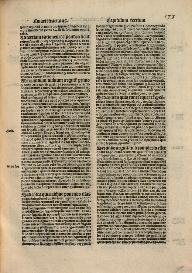 qualitates contrariae se compaterentur, sequeretur, quod mixtio non esset possibilis, sed consequens est falsum. Igitur. Sequela probatur, quia, si qualitates contrariae se compatiuntur, complexio non est possibilis, igitur nec mixtio, cum complexio formam mixti conservat, sine qua forma mixti non posset in materia prima durare. Probatur sequela, quia complexio est qualitas secunda resultans ex actione qualitatum primarum et cetera, ut patet per Avicennam prima fen primi canonis, [...] tertia, sed talis qualitas secunda non est possibilis, igitur nec complexio. Antecedens probatur, quia agentibus et patientibus elementis ad invicem per te in elementum frigidum producitur caliditas in calidum, frigiditas in siccum, humiditas in humidum, siccitas tantummodo, igitur agentibus et patientibus elementis ad invicem non videtur, quomodo ibi generatur una qualitas secunda. Patet consequentia, quia, ubi corrumpitur aliqua qualitas prima, ibi ita cito adaequate producitur sua contraria, quomodo ibi igitur producetur qualitas illa secunda.