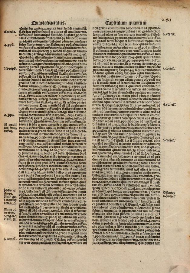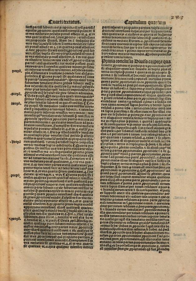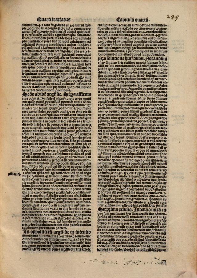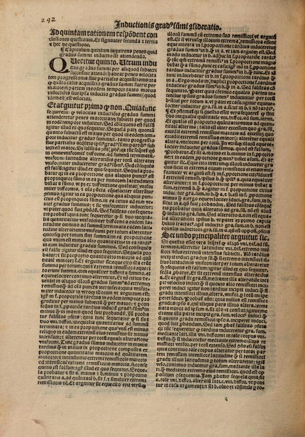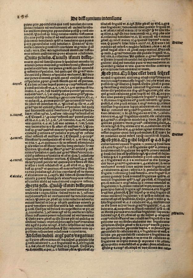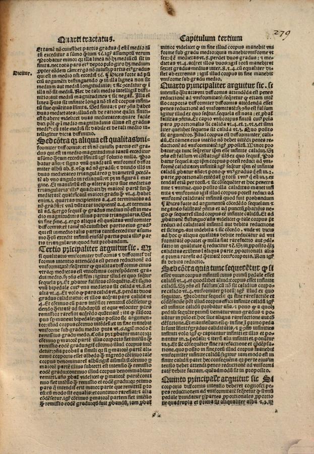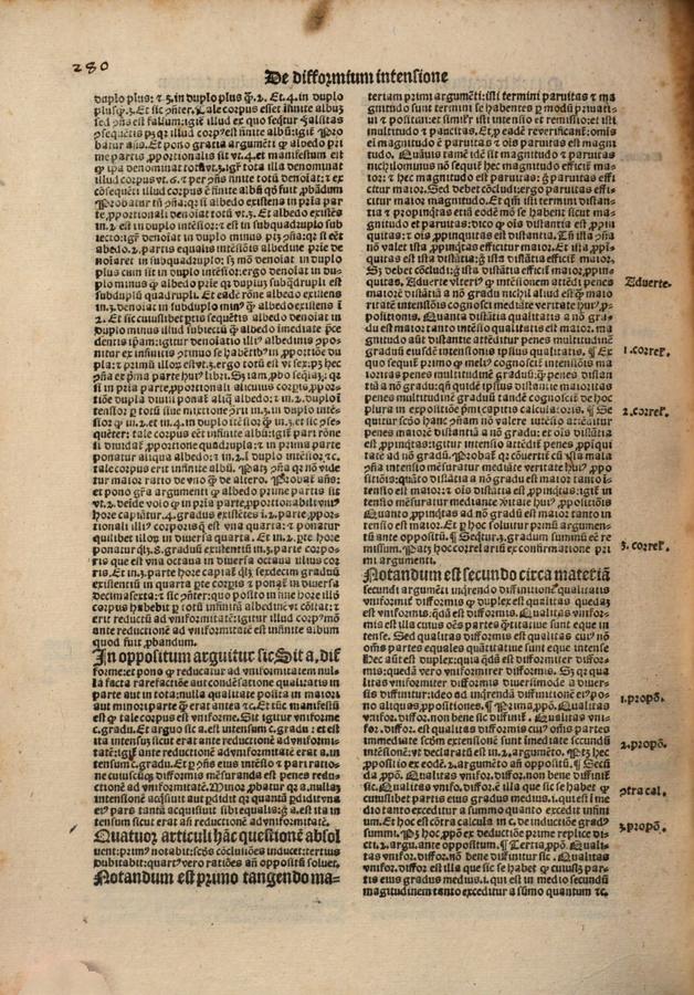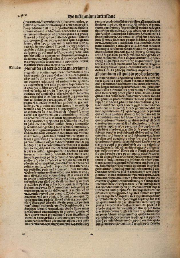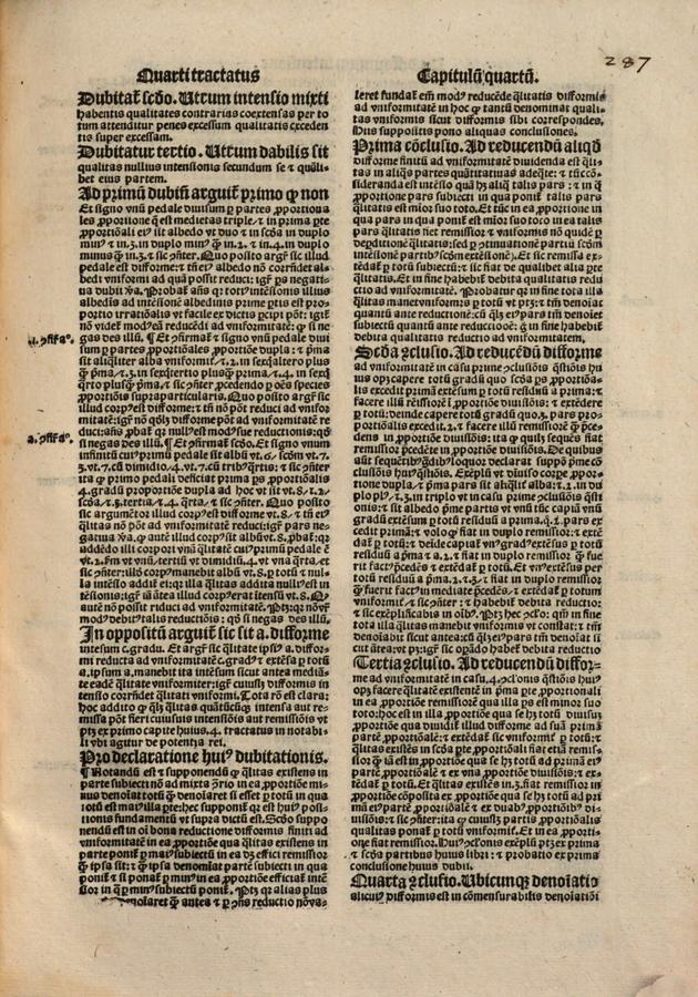 Notandum est secundo circa materiam secundi argumenti inquirendo definitionem qualitatis uniformiter difformis, quod duplex est qualitas: quaedam est uniformis, quaedam est difformis. Qualitas uniformis est illa, cuius omnes partes quantitative sunt aeque intensae. Sed qualitas difformis est qualitas, cuius non omnes partes aequales quantitative sunt aeque intensae. Haec autem est duplex, quia quaedam est uniformiter difformis, quaedam vero uniformiter difformis. Sed quia qualitas uniformiter difformis diversimode a diversis definitur. Ideo ad inquirendam definitionem eius pono aliquas propositiones. ¶ Prima propositio: qualitas unifor[miter] diffor[mis] non bene sic definitur: qualitas unifor[miter] diffor[mis] est qualitas difformis, cuius omnes partes immediatae secundum extensionem sunt immediatae secundum intensionem, ut declaratum est in 2. argumento. Patet haec propositio ex eodem 2. argumento ante oppositum. ¶ Secunda propositio: qualitas unifor[miter] diffor[mis] non bene definitur sic: qualitas unifo[rmiter] diffor[mis] est illa, quae sic se habet, quod cuiuslibet partis eius gradus medius [...], qui est in medio, tanto exceditur a summo, quanto excedit infinium. Et hoc est contra calcula[torem] in c[apite] de inductione gradus summi. Patet hoc propositio ex deductione primae replicae dicti 2. argumenti ante oppositum. ¶ Tertia propositio: qualitas unifor[miter] diffor[mis] non bene definitur sic: qualitas unifor[miter] diffor[mis] est illa, quae sic se habet, quod cuiuslibet partis eius gradus medius [...], qui est in medio secundum magnitudinem, tanto exceditur a summo, quantum et cetera.