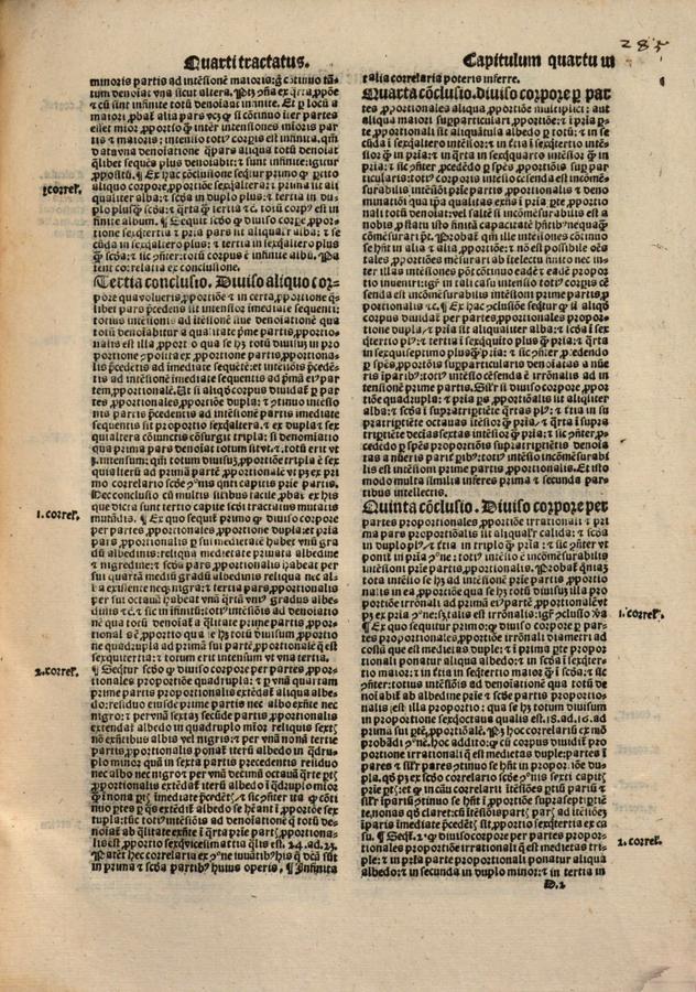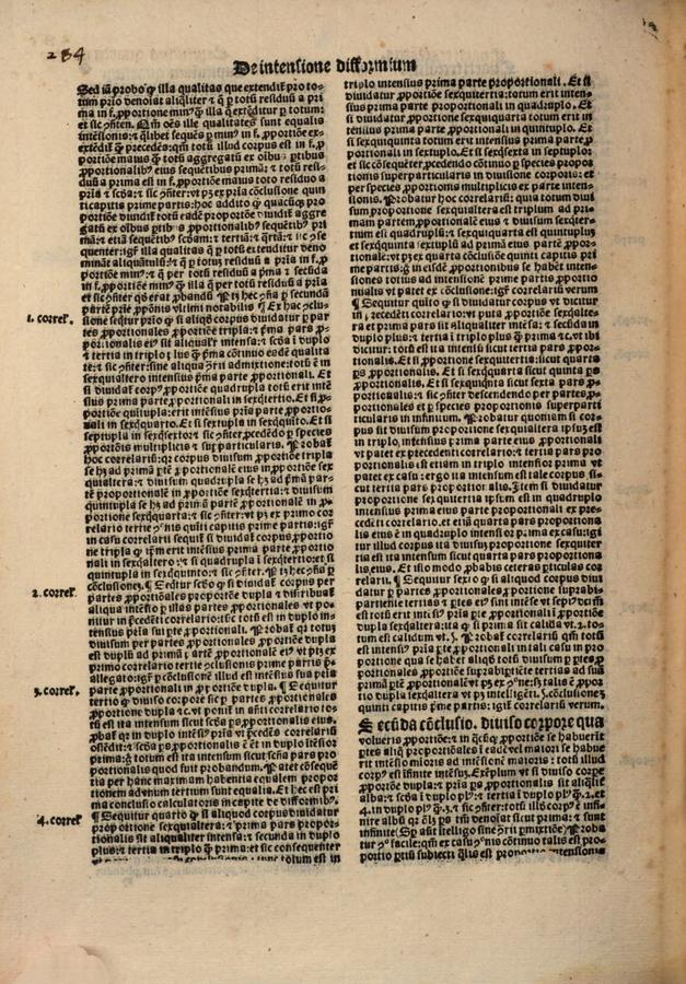 ¶ Sequitur secundo, quod diviso corpore per partes proportionales proportione quadrupla et per unam quartam primae partis proportionalis extendatur aliqua albedo residuo eiusdem primae partis nec alb[]o existente nec nigro, et per unam sextam secundae partis proportionalis extendatur albedo in quadruplo minor reliquis sextis non existentibus albis vel nigris, et per unam nonam tertiae partis proportionalis ponatur iterum albedo in quadruplo minor quam in sexta partis praecedentis residuo nec albo nec nigro, et per unam decimam octavam quartae partis proportionalis extendatur iterum albedo in quadruplo minor quam in nona partis immediate praecedentis et sic consequenter, ita quod continuo partes, per quas extenditur albedo, se habeant in proportione sextupla, tunc totius intensionis ad denominationem, qua totum denominatur ab qualitate existente in quarta primae partis proportionalis, est proportio sesquivicesima tertia, qualis est 24 ad 23. Patent haec correlaria ex conclusione iuvantibus his, quae dicta sunt in prima et secunda partibus huius operis. ¶ Infinita | talia correlaria poteris inferre.