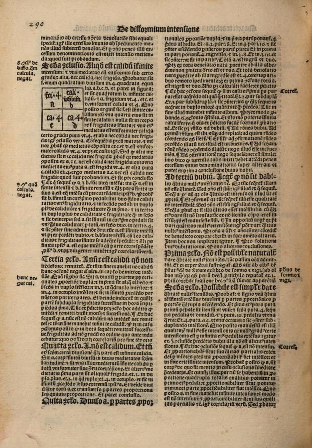 Patet haec propositio ex 2. replica dicti secundi argumenti. ¶ Ex hac propositione sequitur, quod aliqua est qualitas uni[miter] diffor[mis], cuius secundum aliquam divisionem quaelibet pars proportionalis est difformiter difformis. Patet dividendo unum quadratum uniformiter difformem per lineas transversales sive diametrales. ¶ Quarta propositio: qualitas unifor[miter] diffor[mis] non bene definitur sic: qualitas unifor[miter] diffor[mis] est illa, quae sic se habet, quod secundum aliquam eius divisionem cuiuslibet partis gradus medius [...], qui est in medio et cetera. Probatur, quia illa definitio sic intellecta convenit illi qualitati, quae non est uniformiter difformis, de qua fit mentio in 2. argumento ante oppositum, esto, quod illa dividatur per partes proportionales proportione dupla, ut constat intelligenti casum. ¶ Quinta propositio: qualitas unifor[miter] diffor[mis] non bene definitur sic: qualitas unifor[miter] diffor[mis] est illa, quae sic se habet, quod secundum aliquam divisionem dividendo secundum ter[ti]am dimensionem cuiuslibet partis eius gradus, qui est in medio secundum magnitudinem, tantum exceditur a summo, quanto et cetera. Probatur, quia capto quadrato perfecto, cuius una [sit] in medio procedens ab uno latere in reliquum, sit uniformiter difformis ab 8 usque ad 4. Et una alia [sit] ex transverso procedens usque ad alteram, ex utroque latere per modum crucis sit etiam uniformiter difformis ab 8 usque ad 4. Et residuae partes sint uniform[e]s. Tunc manifestum est illam qualitatem non esse uniformiter difformem, et tamen illa definitio ei convenit, ut patet intelligenti casum. Igitur illa definitio nulla. Hoc videas clarius in expositione 2. capitis calculatoris
