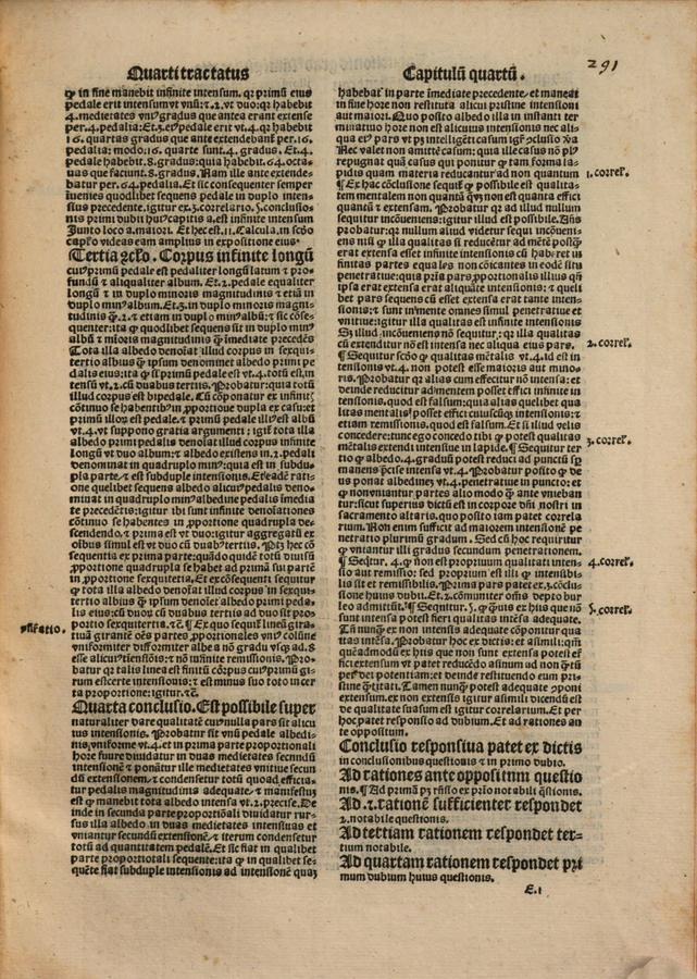 Quarta conclusio: diviso corpore per partes proportionales aliqua proportione multiplici aut aliqua maiori superparticulari proportione, et in prima parte proportionali sit aliquantula albedo per totum, et in secunda in sesquialtero intensior, et in tertia in sesquitertio intensior quam in prima, et in quarta in sesquiquarto intensior quam in prima et sic consequenter procedendo per species proportionis superparticularis, totius corporis intensio censenda est incommensurabilis intensioni primae partis proportionalis et denominationi, qua ipsa qualitas existens in prima parte proportionali totum denominat, vel saltem – si incommensurabilis est – a nobis pro flatu isto finitam capacitatem habentibus nequaquam commensurari potest. Probatur, quia illae intensiones continuo se habent in alia et alia proportione, et non est possibile omnes tales proportiones mensurari ab intelectu finito, nec inter illas intensiones potest continuo eadem et eadem proportio inveniri, igitur in tali casu intensio totius corporis censenda est incommensurabilis intensioni primae partis proportionalis et cetera. ¶ Ex hac conclusione sequitur, quod si aliquod corpus dividatur per partes proportionales proportione dupla, et prima sit aliqualiter alba, et secunda in sesquitertio plus, et tertia in sesquiquinto plus quam prima, et quarta in sesquiseptimo plus quam prima et sic consequenter procedendo per species proportionis superparticularis denominatas a numeris imparibus, totius intensio censenda est irrationalis ad intensionem primae partis. Similiter si diviso corpore proportione quadrupla, et prima pars proportionalis sit aliqualiter alba, et secunda in supratripartiente quartas plus, et tertia in supratripartiente octavas intensior quam prima, et quarta in supratripartiente decimas sextas intensior quam prima et sic consequenter procedendo per species proportionis supratripartientis denominatas a numeris pariter paribus, totius intensio incommensurabilis est intensioni primae partis proportionalis. Et isto modo multa similia inferes prima et secunda partibus intellectis.