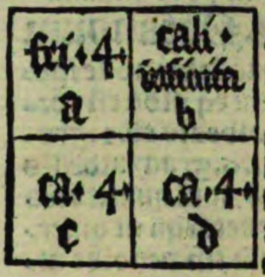 Secunda conclusio: aliquod est calidum infinite intensum, et una medietas est uniformis sub certo gradu, et alia nec calida nec frigida. Probatur, sit F unum quadratum divisum in 4 quadrata aequalia A, B, C, D, ut patet in figura, et sit quadratum B infinite calidum, et A frigidum ut 4, et C et D uniformiter calida ut 4. Quo posito arguitur sic: F est infinite calidum, cum una quarta eius sit infinite calida, et nulla sit in corpore F frigiditas infinita, et una eius medietas est uniformiter calida certo gradu, puta ut 4, et alia nec calida nec frigida, igitur conclusio vera. Consequentia patet cum maiore, et minor probatur, quia medietas composita ex C et D est uniformiter calida ut 4, ut patet ex casu. Igitur. Sed quod alia medietas sit nec calida nec frigida, probatur, quia medietas composita ex A et C nec est calida nec frigida, quia una medietas eius, puta A, est frigida ut 4, et alia, puta C, calida et 4. Ergo medietas AC nec est calida nec frigida. Quod fuit probandum. Et sic patet conclusio. ¶ Ex quo sequitur, quod A et B sunt inaeque intensa, ita quam A est infinite intensum, et B infinite remissum, et quaelibet pars finita ipsius A est aeque intensa cum parte correspondente ipsius B. Probatur, sit B infinitum, in cuius primo pedali sint duo gradus caliditatis et unus frigiditatis, et in secundo pedali in duplo plus de caliditate et frigiditate quam in primo, et in tertio in duplo plus de caliditate et frigiditate quam in secundo et sic deinceps, sed A sit infinitum, in cuius primo pedali sit unus gradus caliditatis per totum, in secundo duo, in tertio 4, et sic consequenter sine admixtione contrarii, tunc A est infinite intensum, ut patet ex praecedenti dubio, et B infinite remissum, cum in eo caliditas et frigiditas infinite se adaequate impediant, et quaelibet pars finita ipsius A est aeque intensa cum parte correspondente ipsius B, ut patet diligenter intuenti, igitur correlarium verum.
